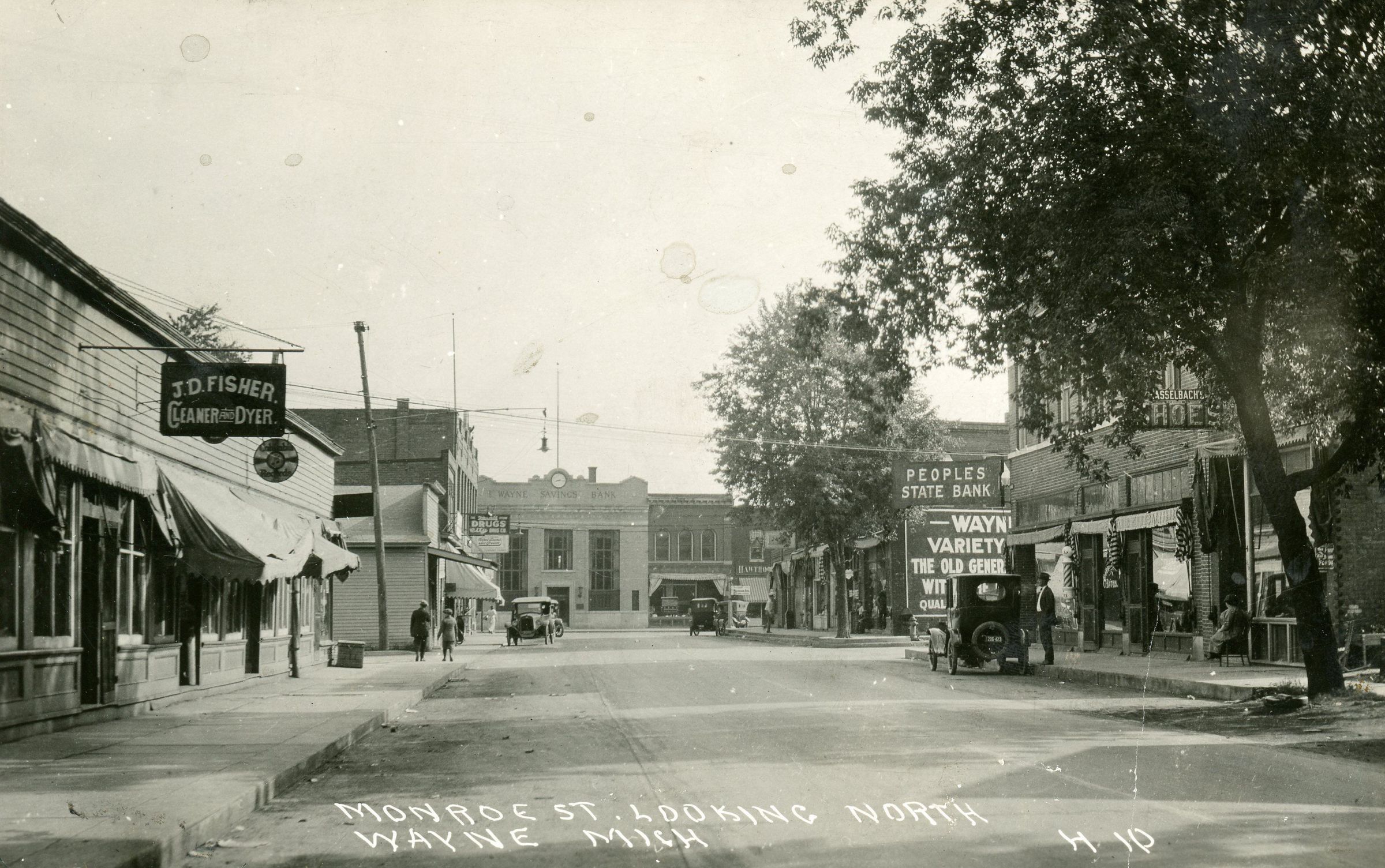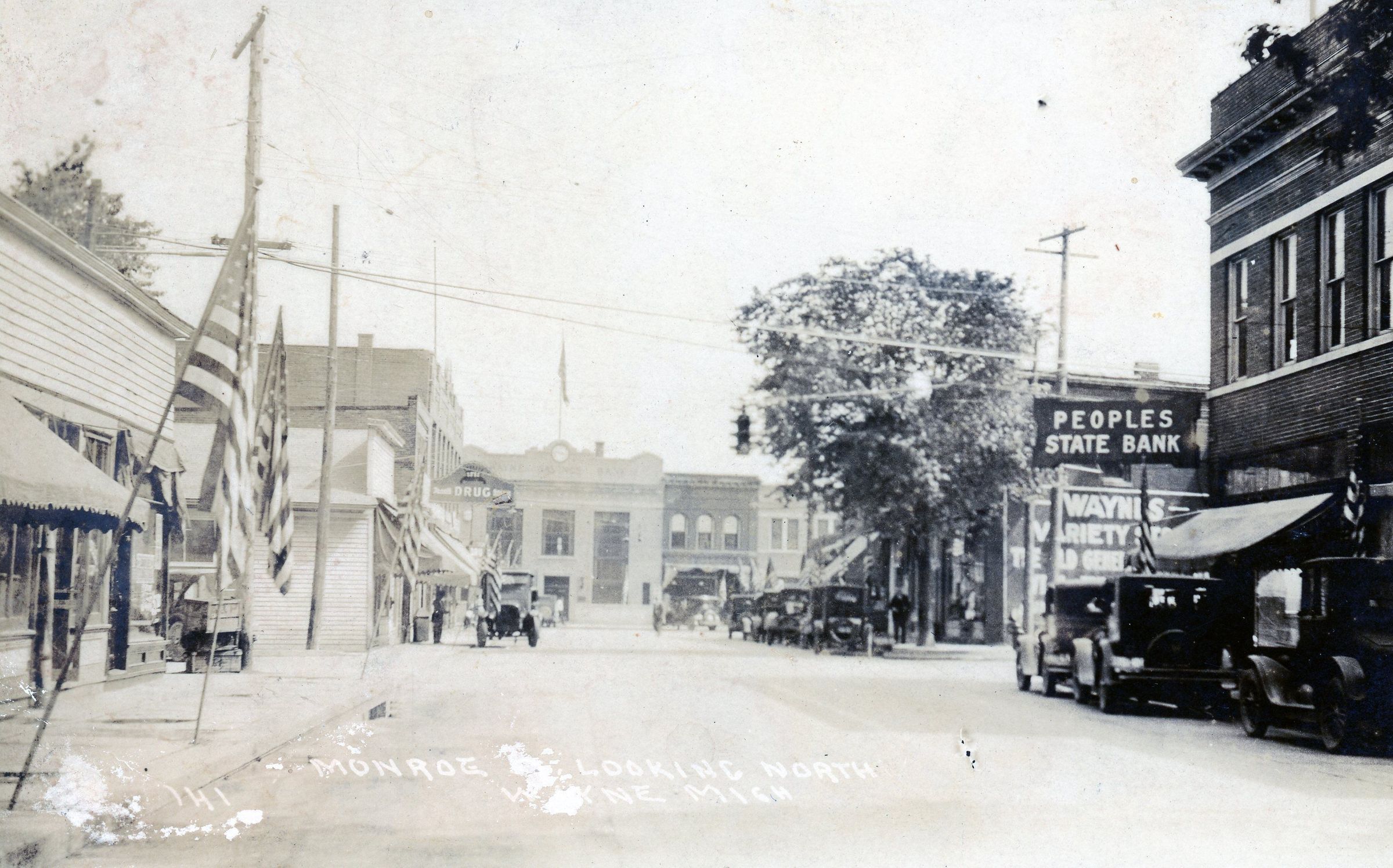 Monroe looking North between Main and Park. Bank/ Masonic building at right.
