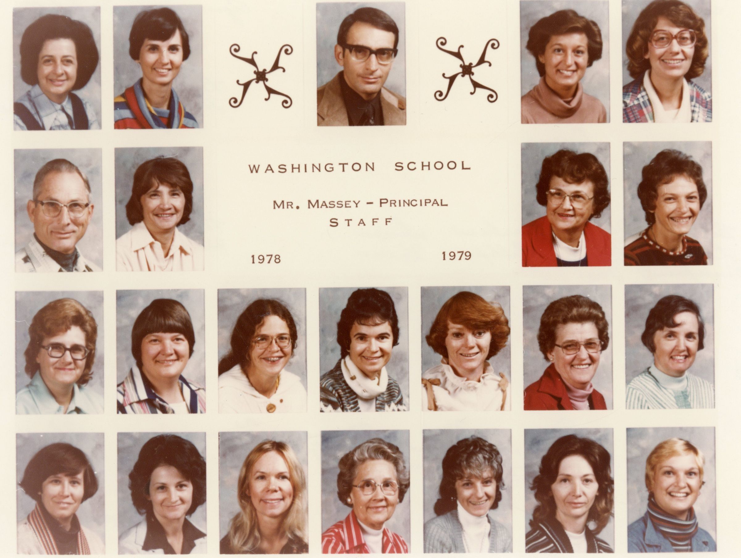 Washington School Staff 1978-79. (L-R) Amelia Toupin, UK, Don Massey (Principal), Diana Aquina, Matilda Mitchell. Uk, Pat Evans, Bette Herron (Secretary), James Swinford. Betty Lada, helen Dearth Pollack, Barbara Phillips, Susan Knaus, UK, Phyllis Hallman, Pat Laveroni. UK, Mrs. Mihail, Mrs. Bowman, Myrna Smeltzer, Karen, UK, Alice Duke.Cataloged By