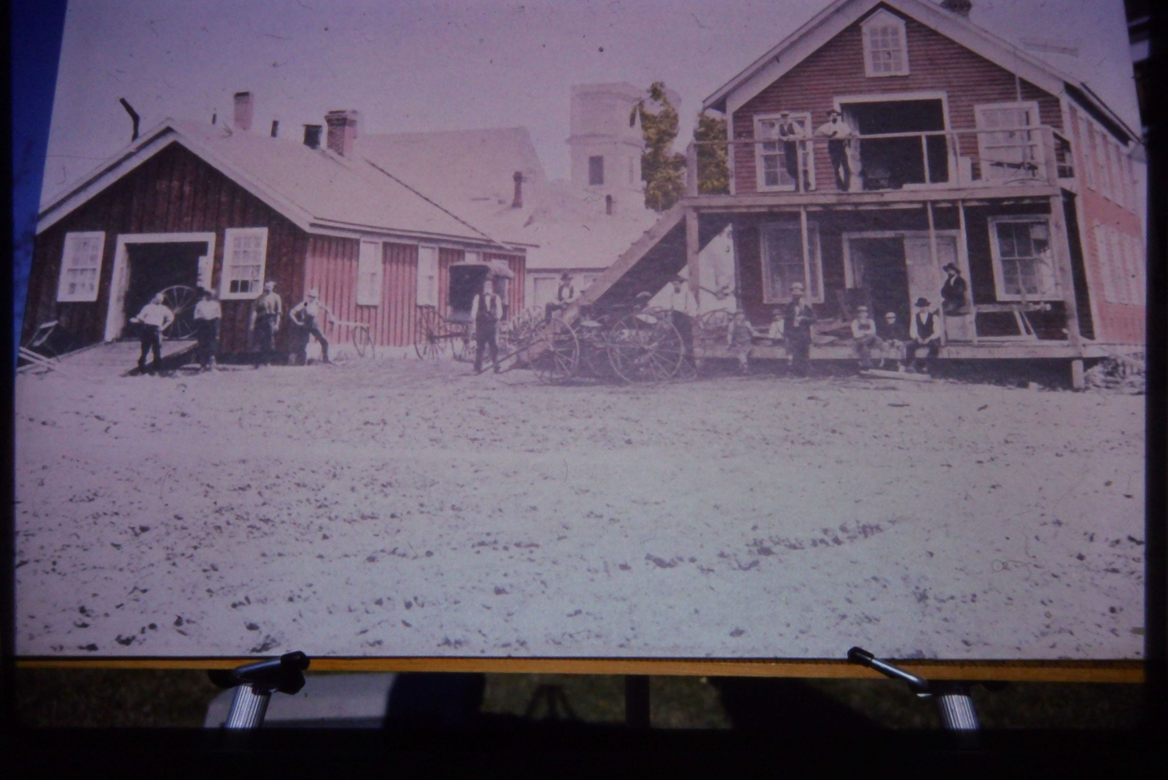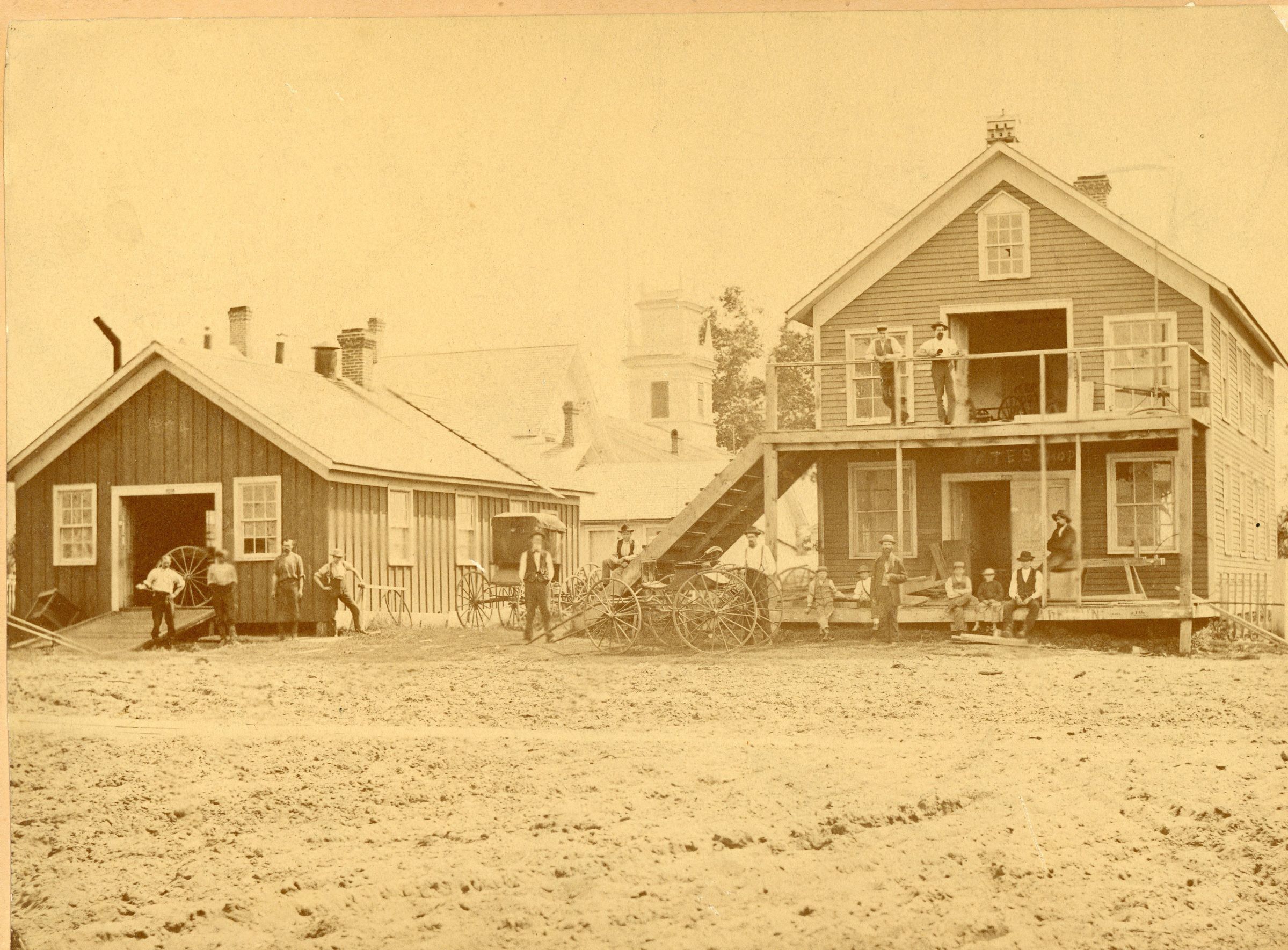 Pates Blacksmith and Wagon Shop, 1880. Park Street. Steeple of Congregational church in background. Photo donated by Albert Parker.Cataloged By