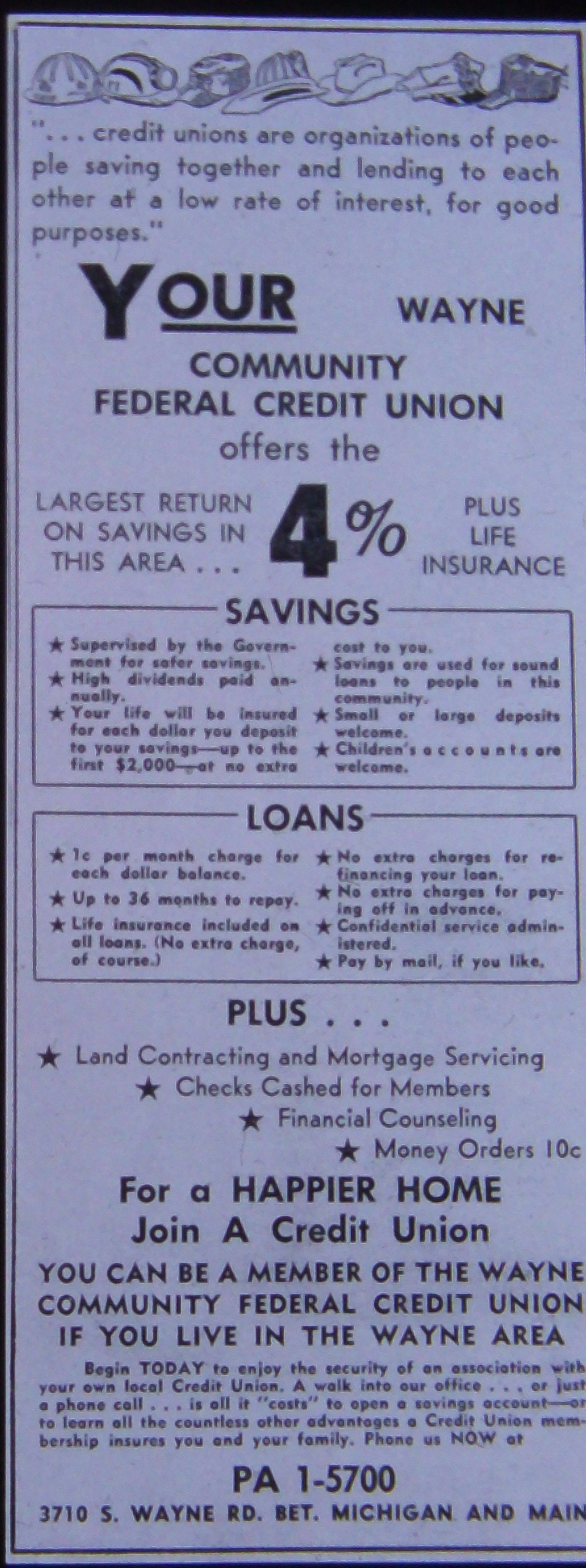 Wayne Community Federal Credit Union located on 3710 S Wayne Way. Photo taken by Ford Photo Service in March 1959.Cataloged By