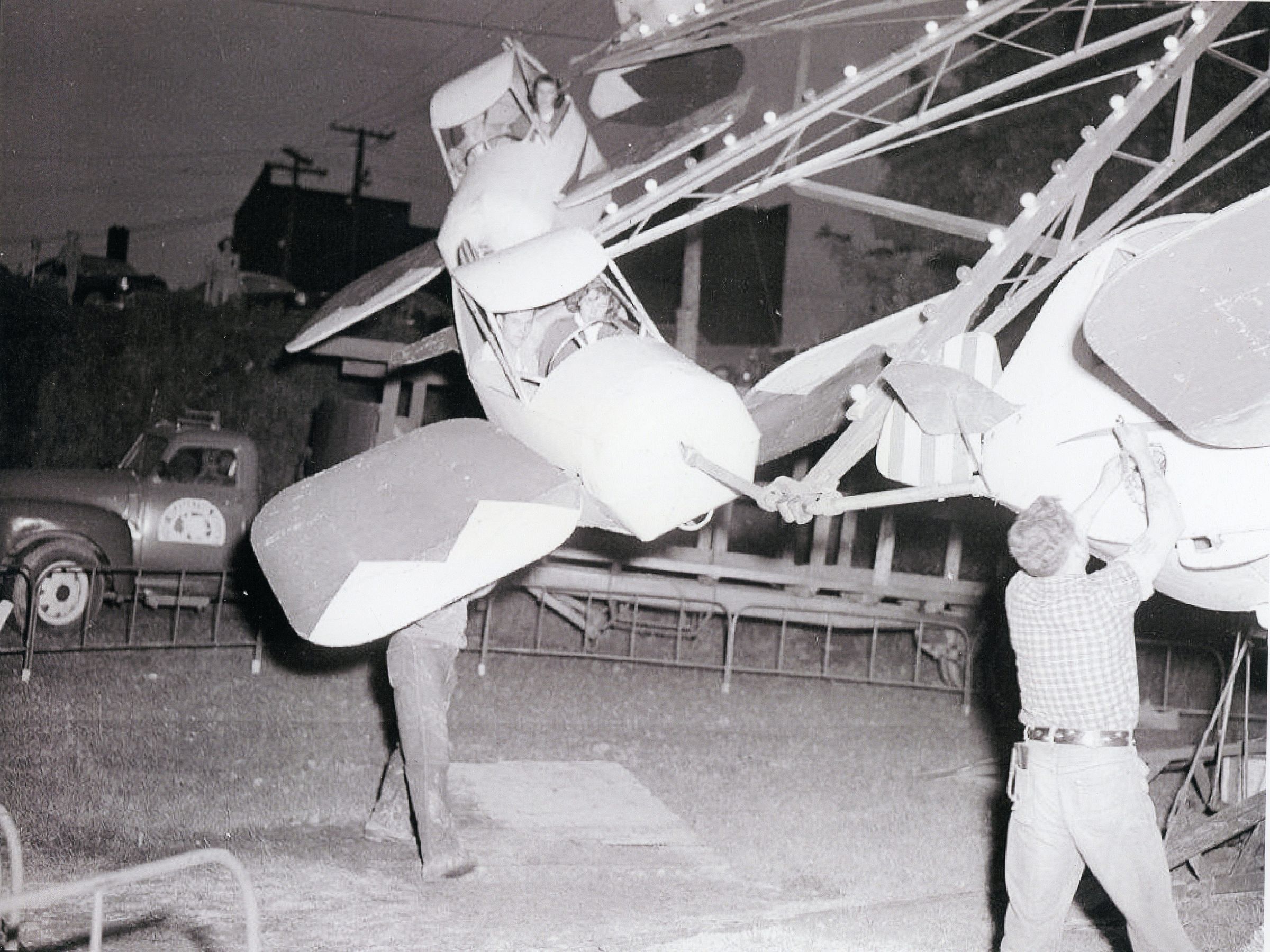 Rotary Carnival 1954. In flats behind Sims. Airplane carnival Ride