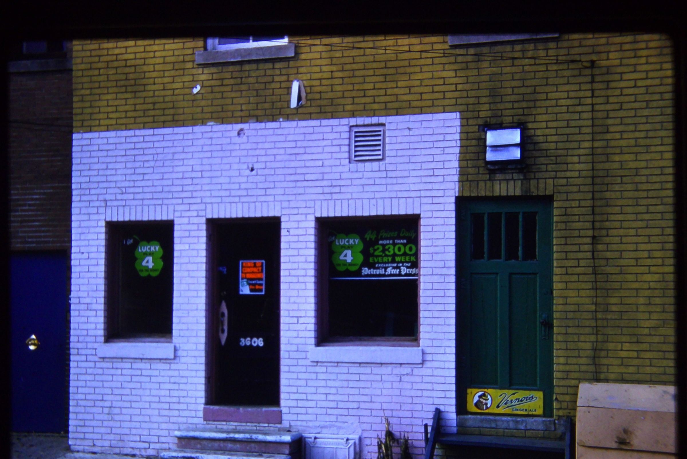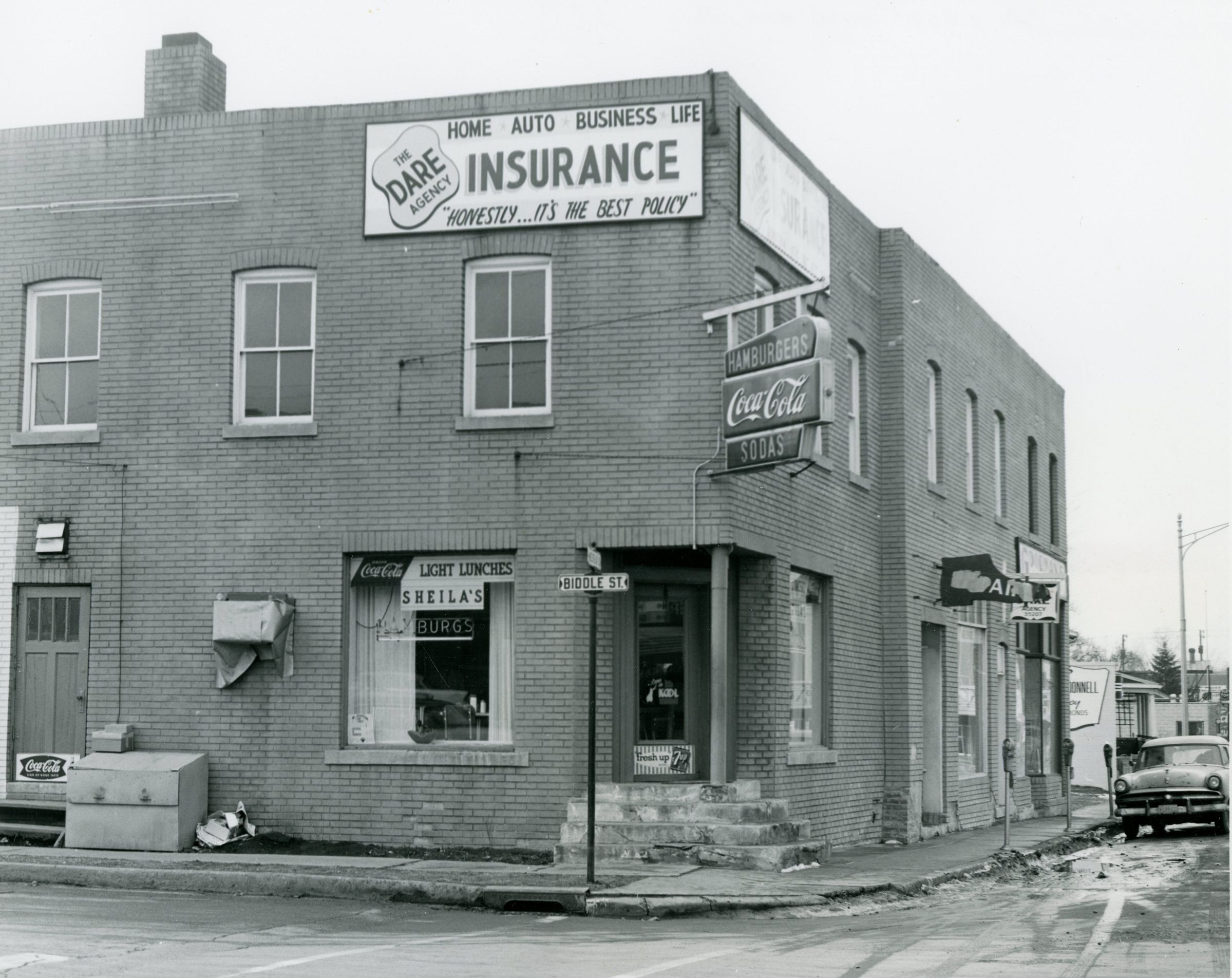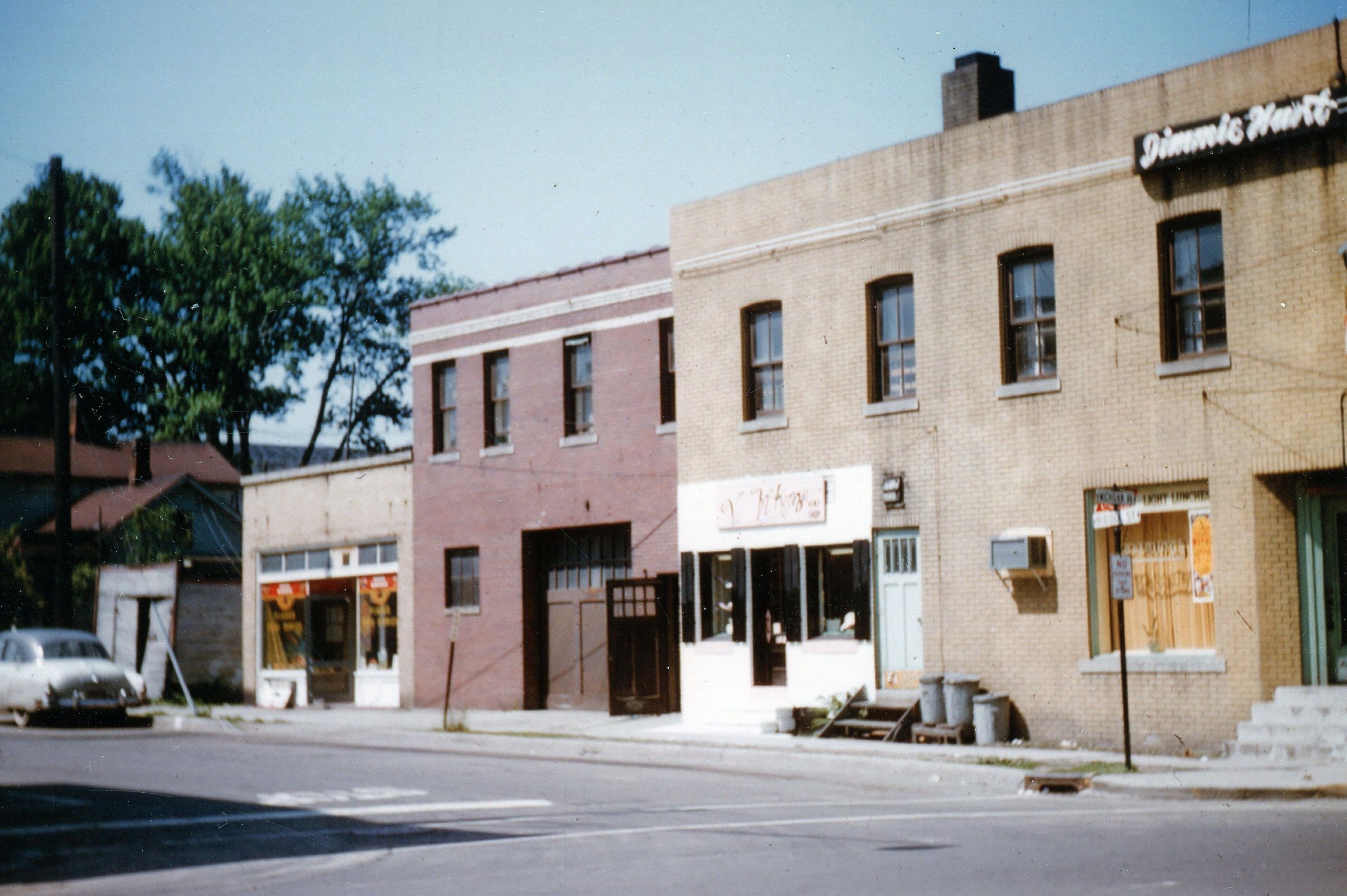 SW corner Michigan and Biddle. South side, Looking SW towards Biddle street. 35201, 35205, 35207, 35209 are addresses on SW corner. Sheilas Restaurant and Goodmans Feed. Torn down for Urban Renewal.Cataloged By