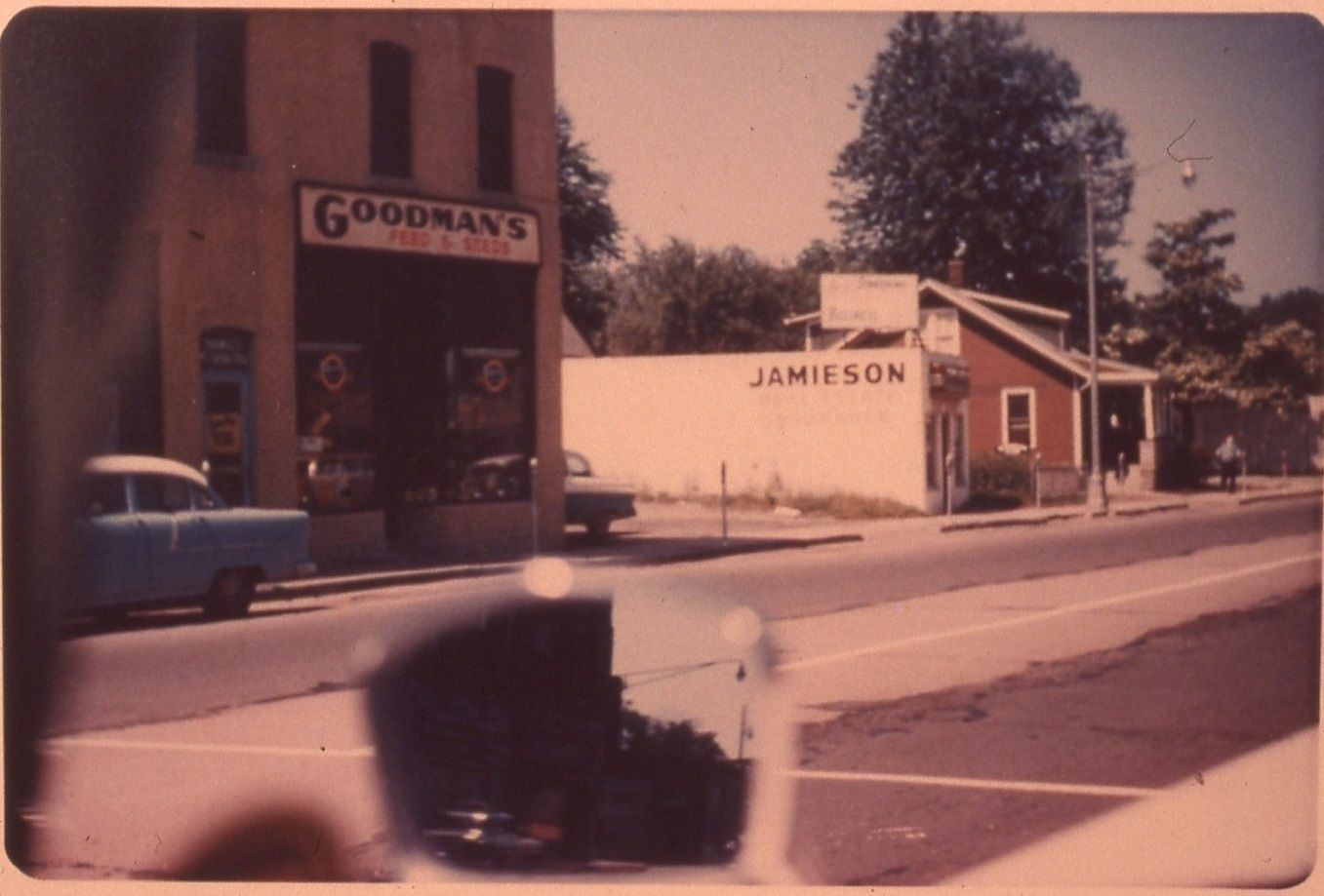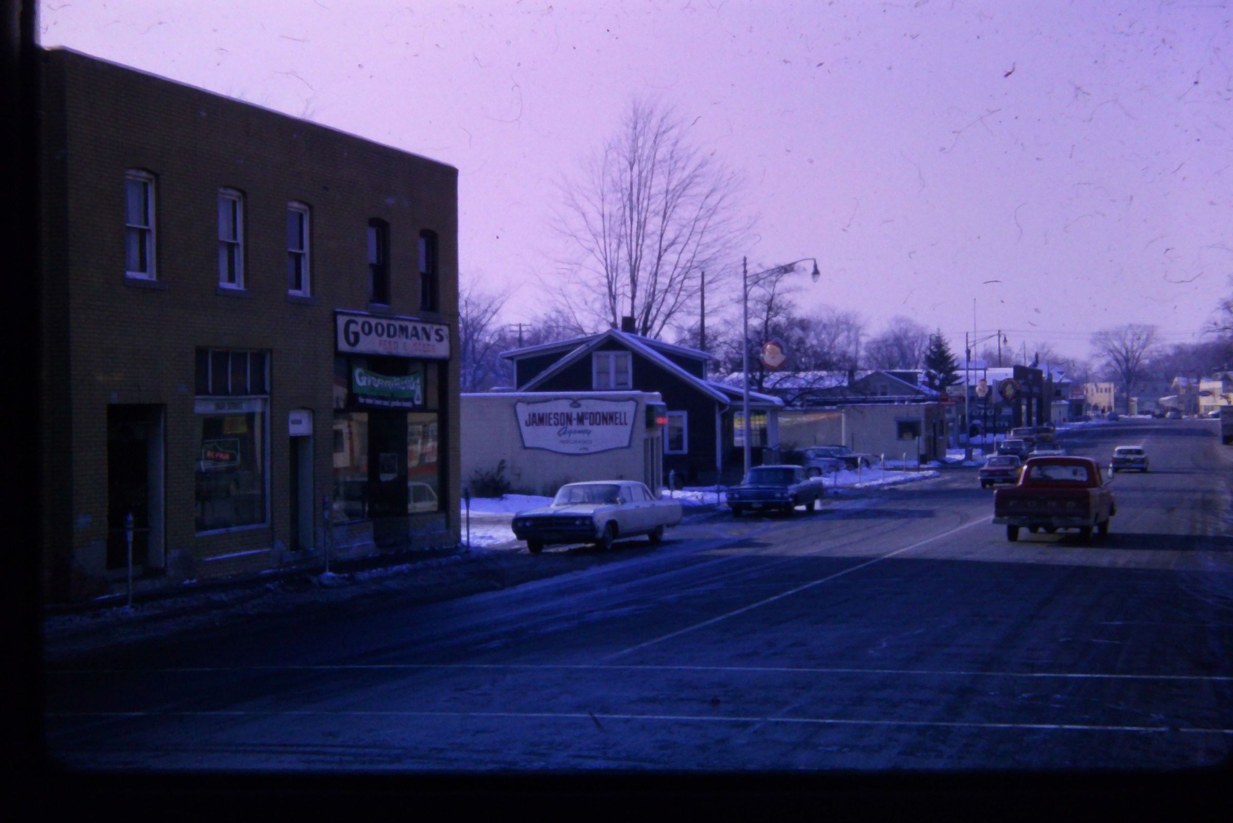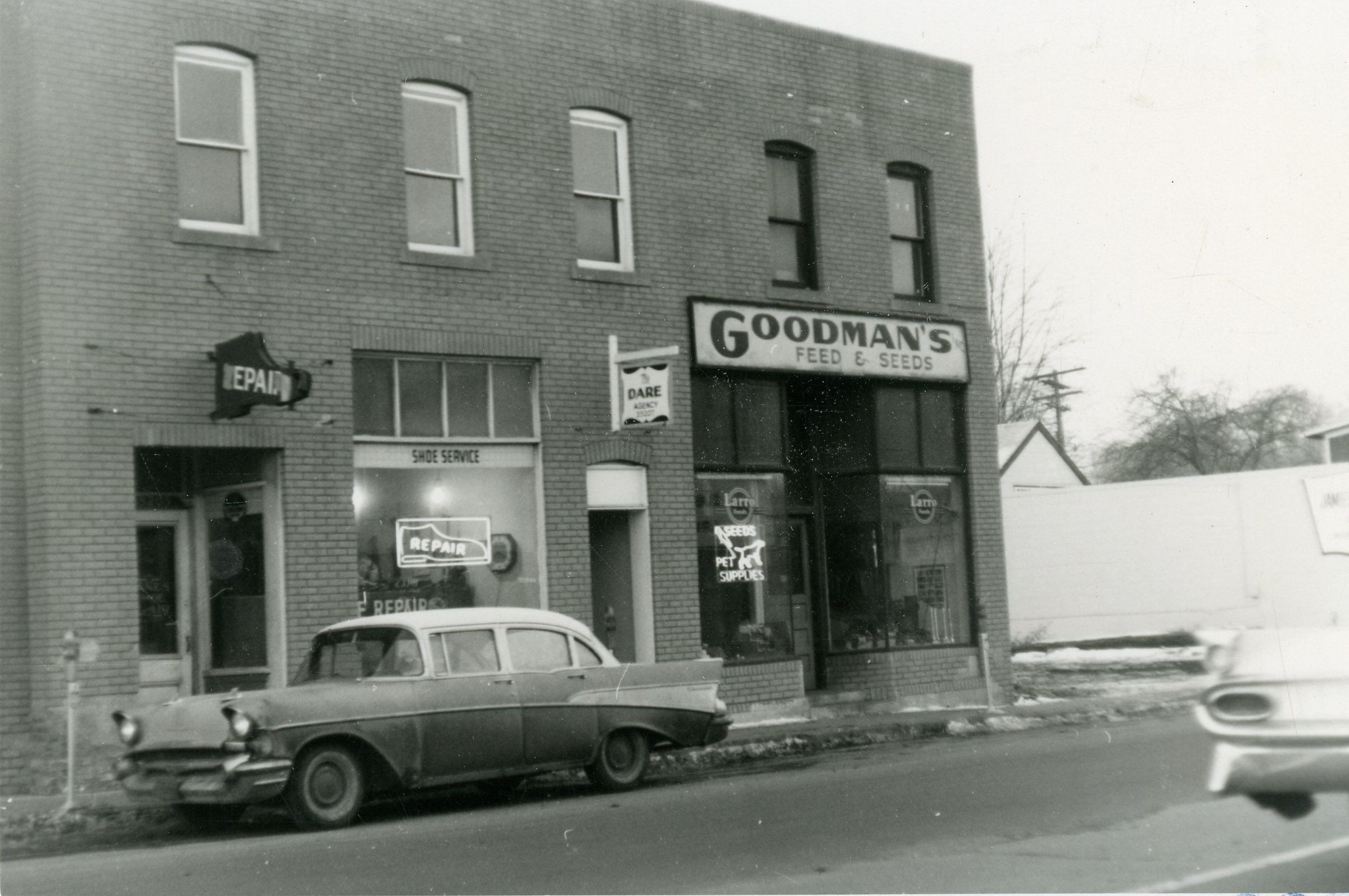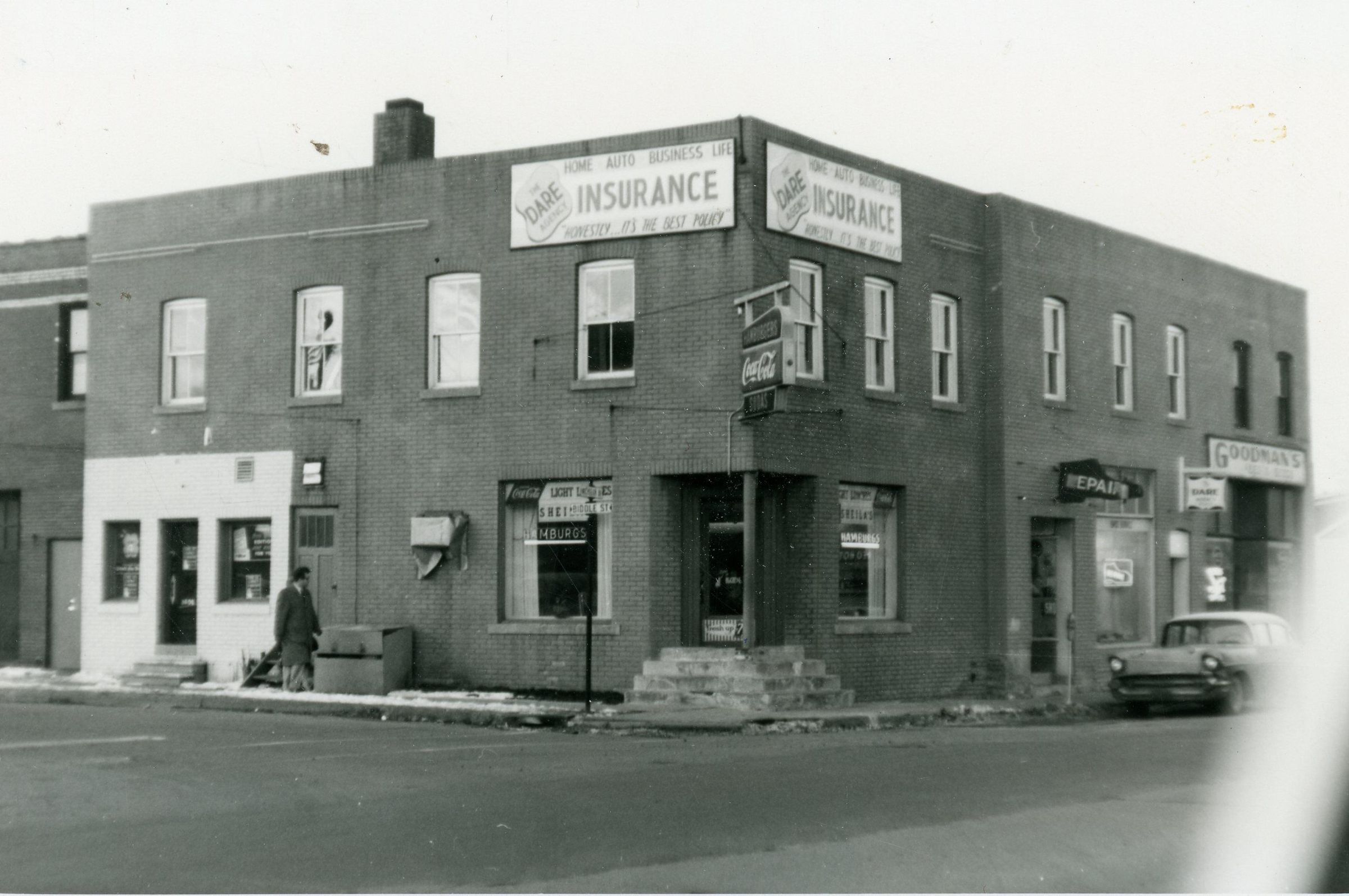 SW corner Michigan and Biddle. South side, Looking SW towards Biddle street. 35201, 35205, 35207, 35209 are addresses on SW corner. Sheilas Restaurant and Goodmans Feed. Torn down for Urban Renewal.Cataloged By