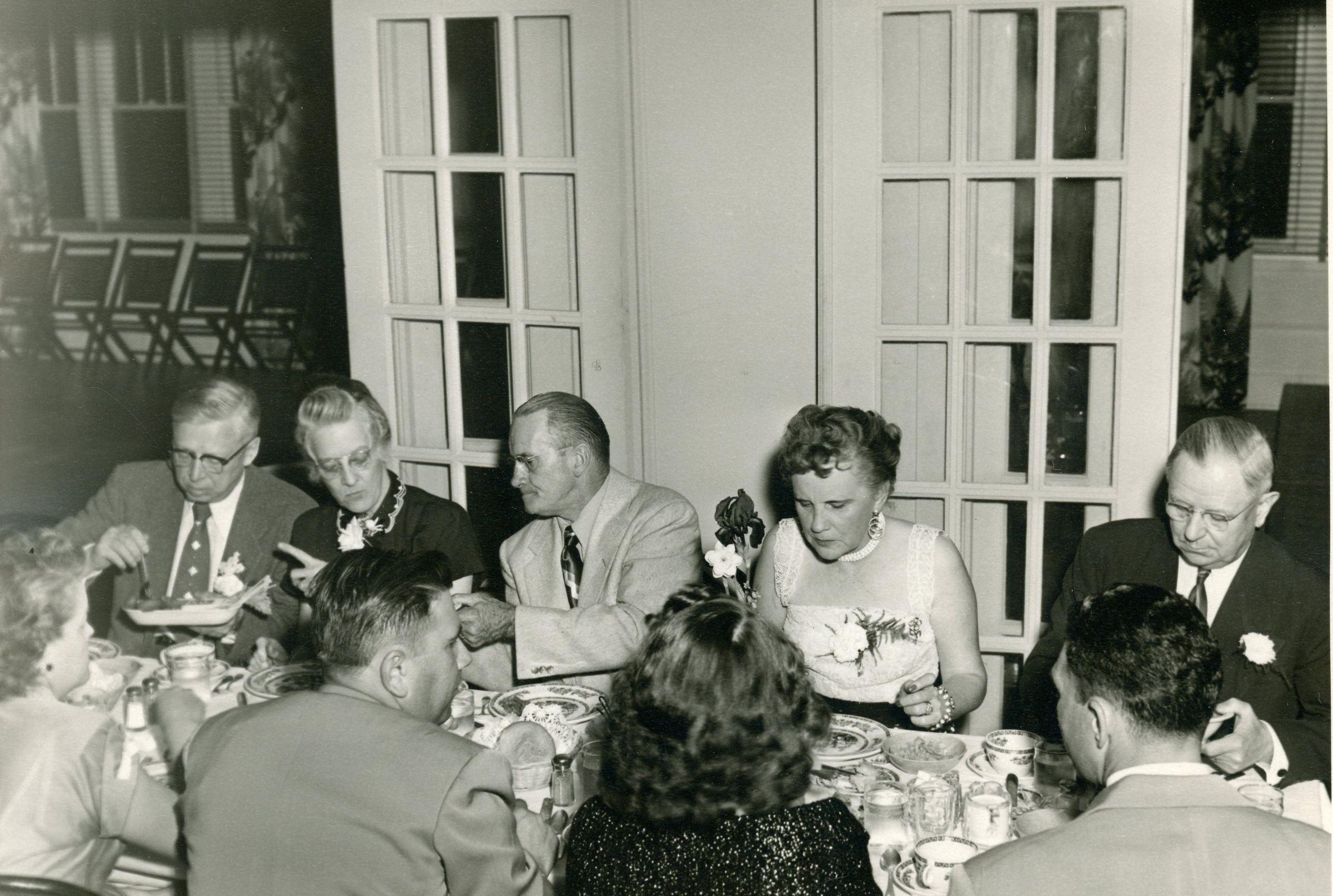 From Left to Right, on side of table facing camera; Vern Snyder, Mrs. Uht, Harold Maas, Mac Scarlett and Mantous Uht. Photo was taken by G.J Ford, Jr. This photo was form Diana Mast.Cataloged By