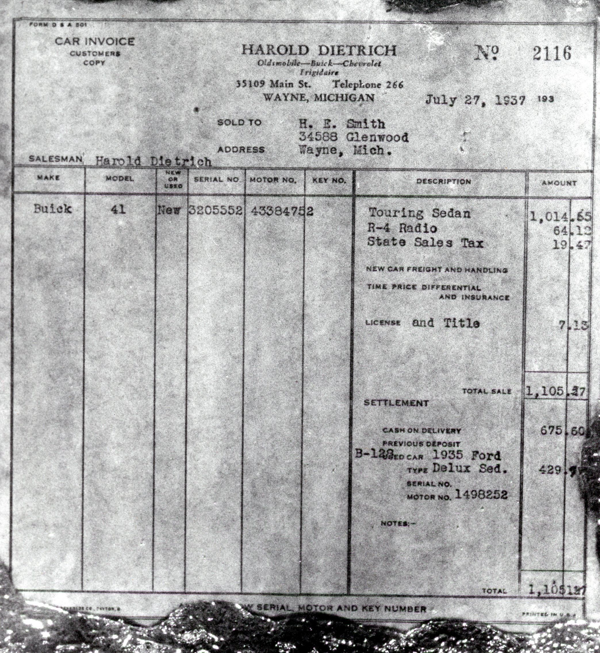 Harold Dietrich Car Invoice, dated July 27, 1937. Harold Dietrich Auto Dealer was located at 35109 Main St in Wayne, MI 48184.