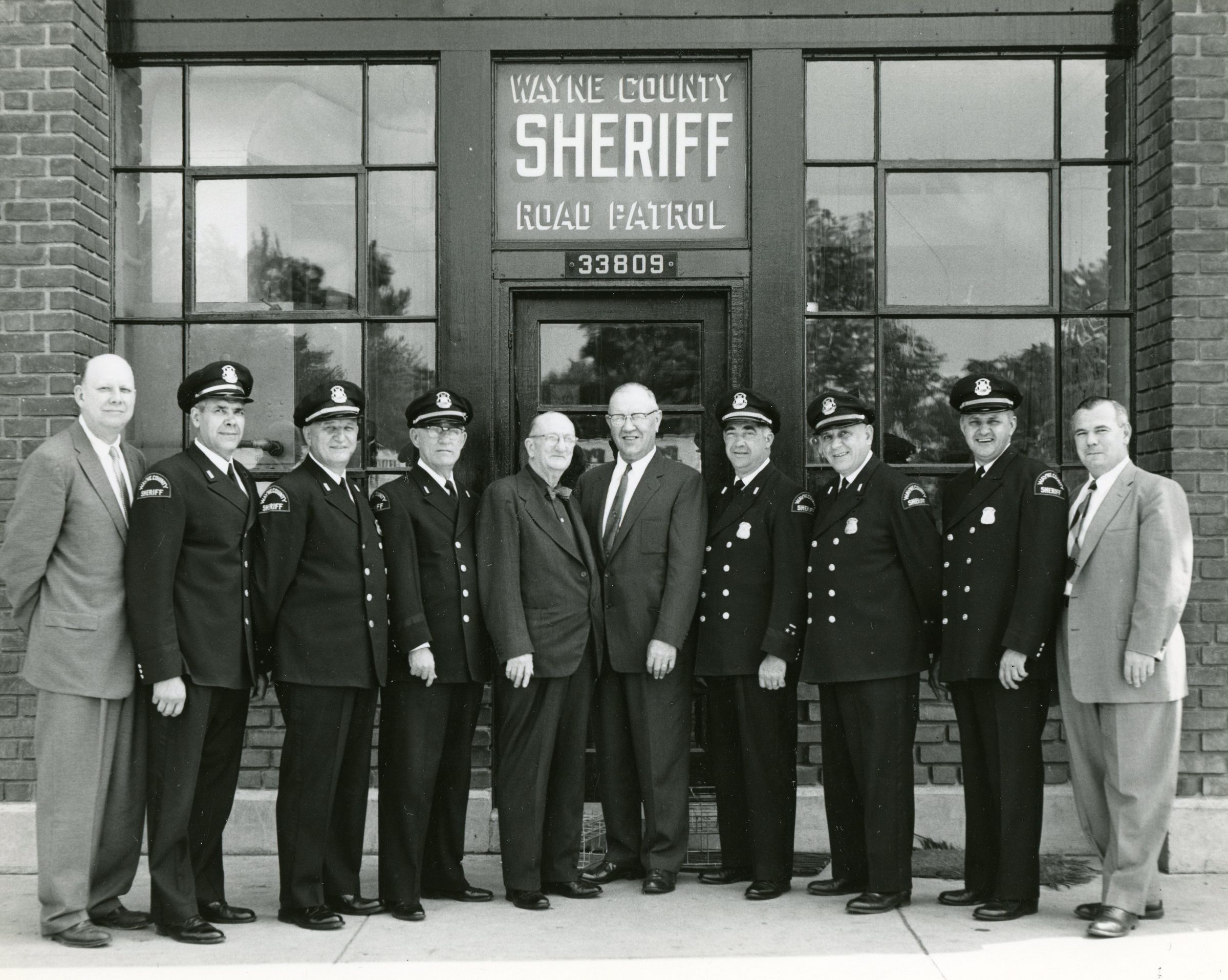 Wayne County Sheriff Department in June 1957 when the department was at Michigan Avenue and Howe Road. LtoR: Captain Steve Derezinski, Lieut. Ronald La'Rue, Lieut. Joseph Kopos, Captain William Smith, Sheriff Andrew C Baird, Inspector Paul Wencel, Lieut. Joseph Kovacs, Lieut. John Jankowski, Lieut. Dan D Martin, Captain Gordon Traye.Cataloged By