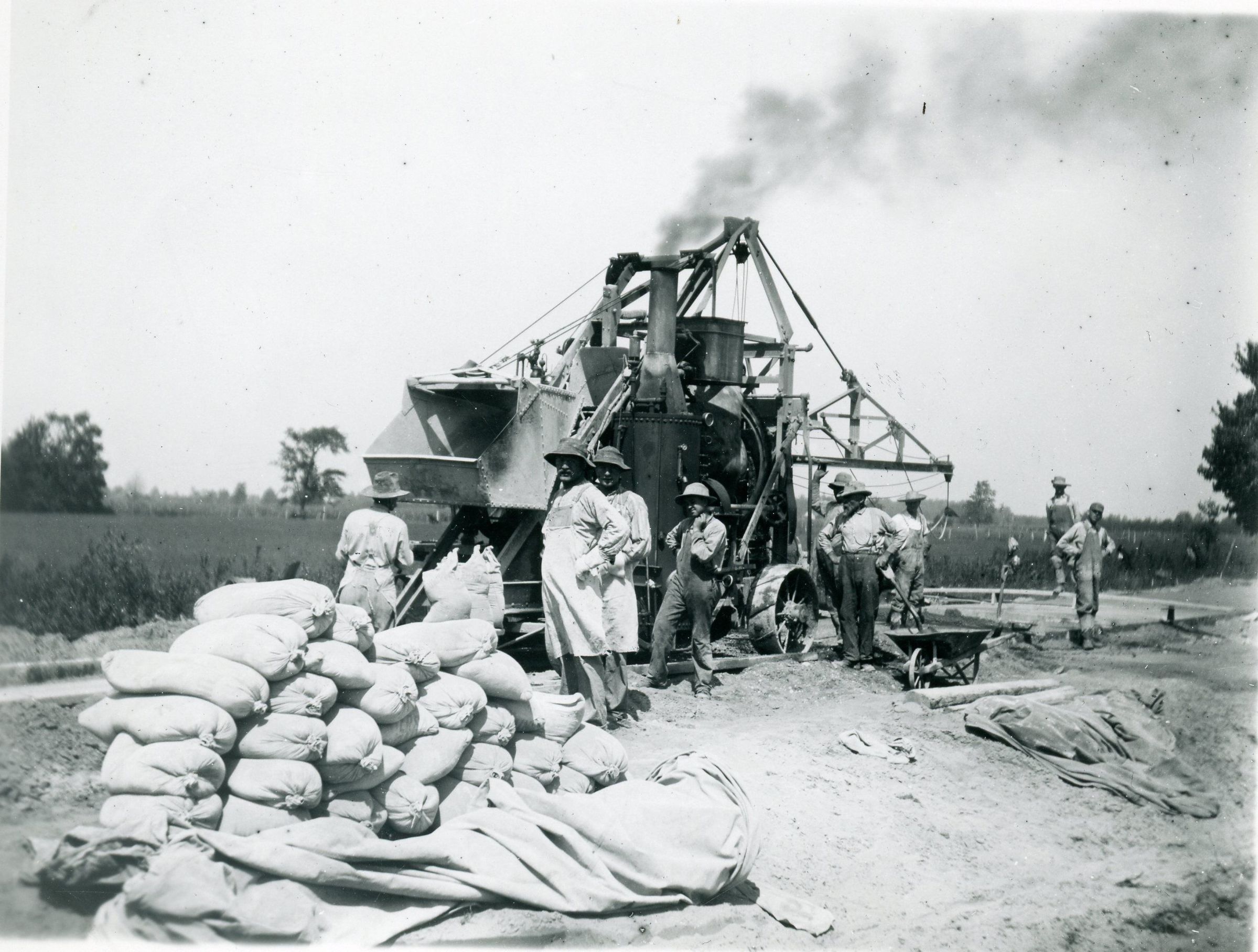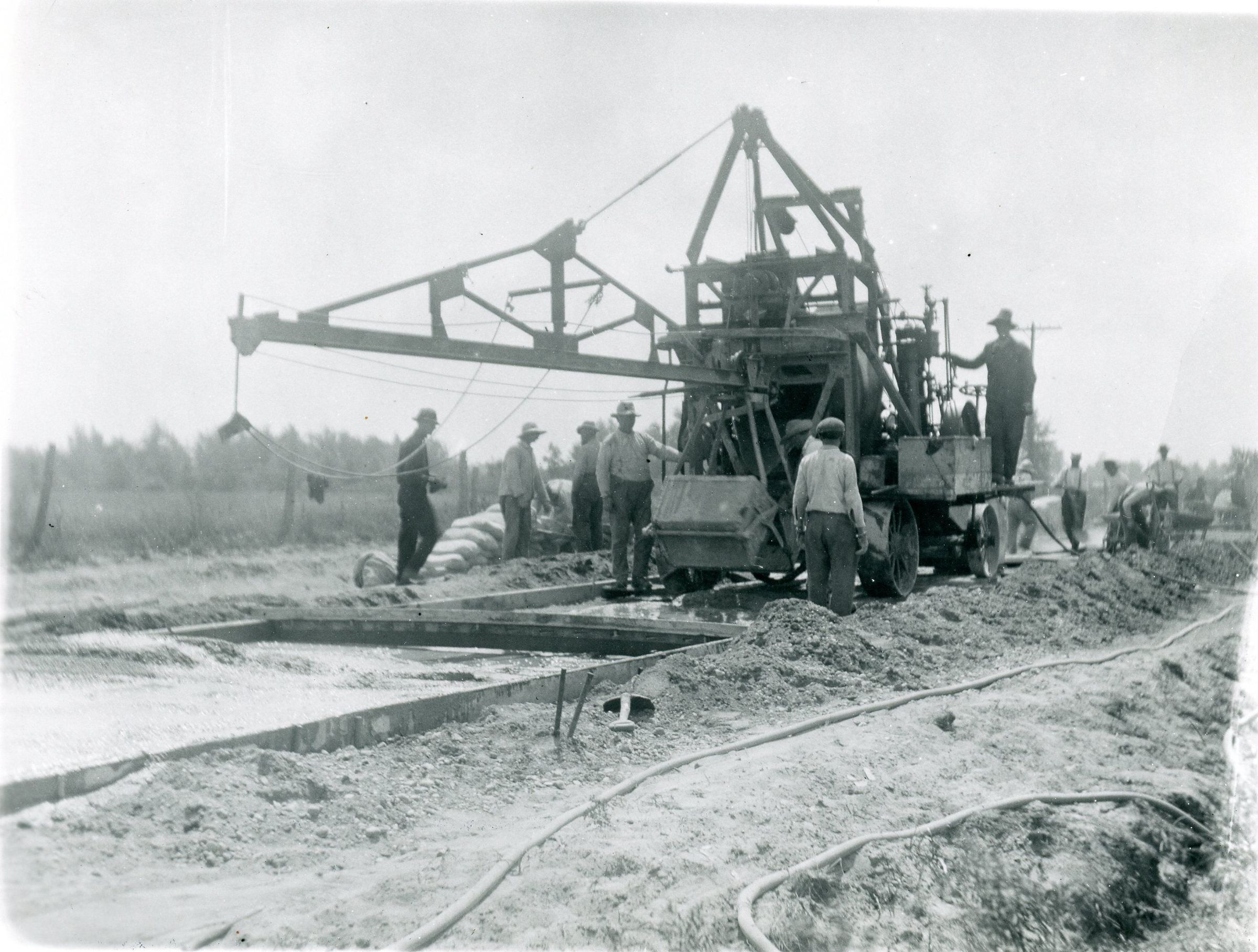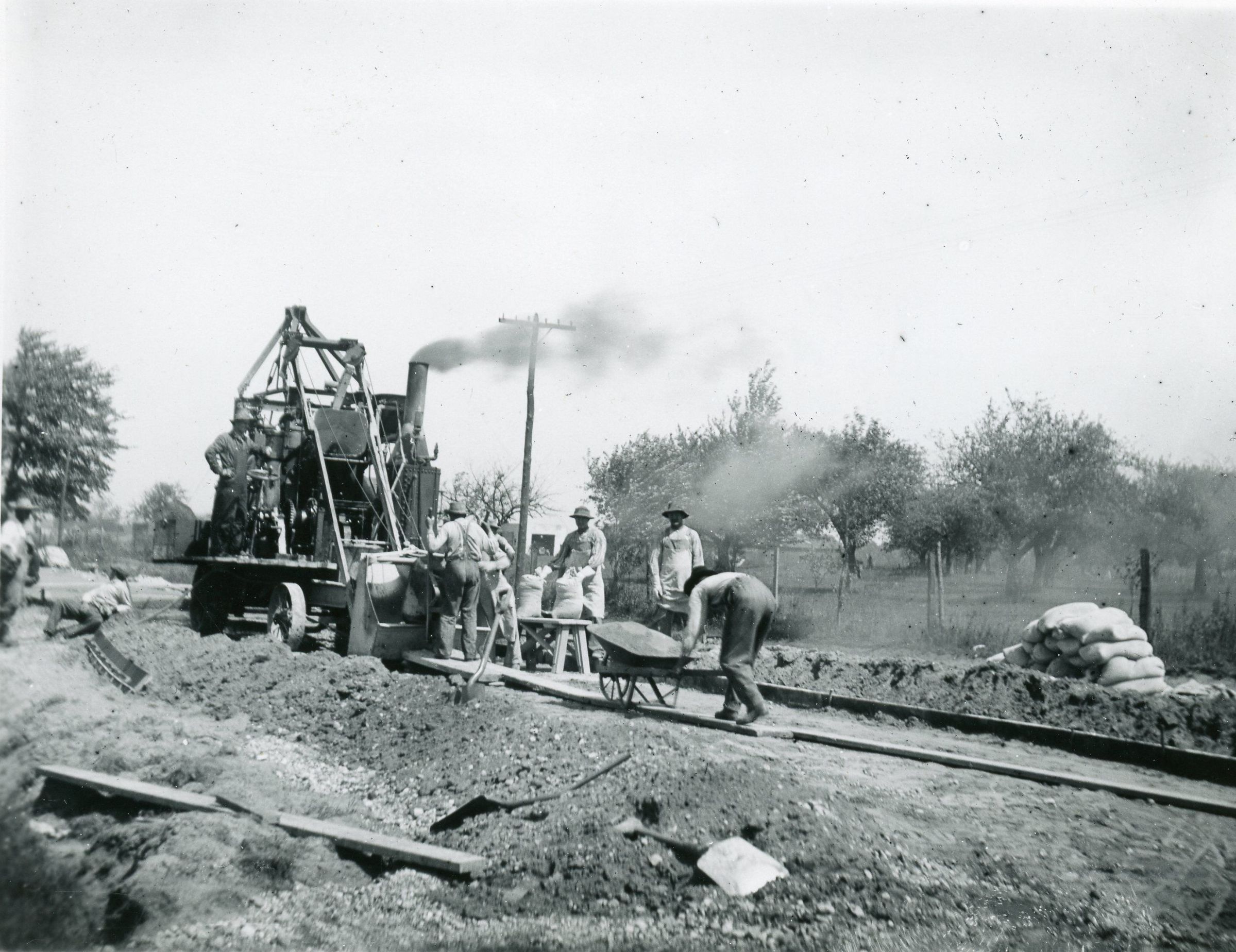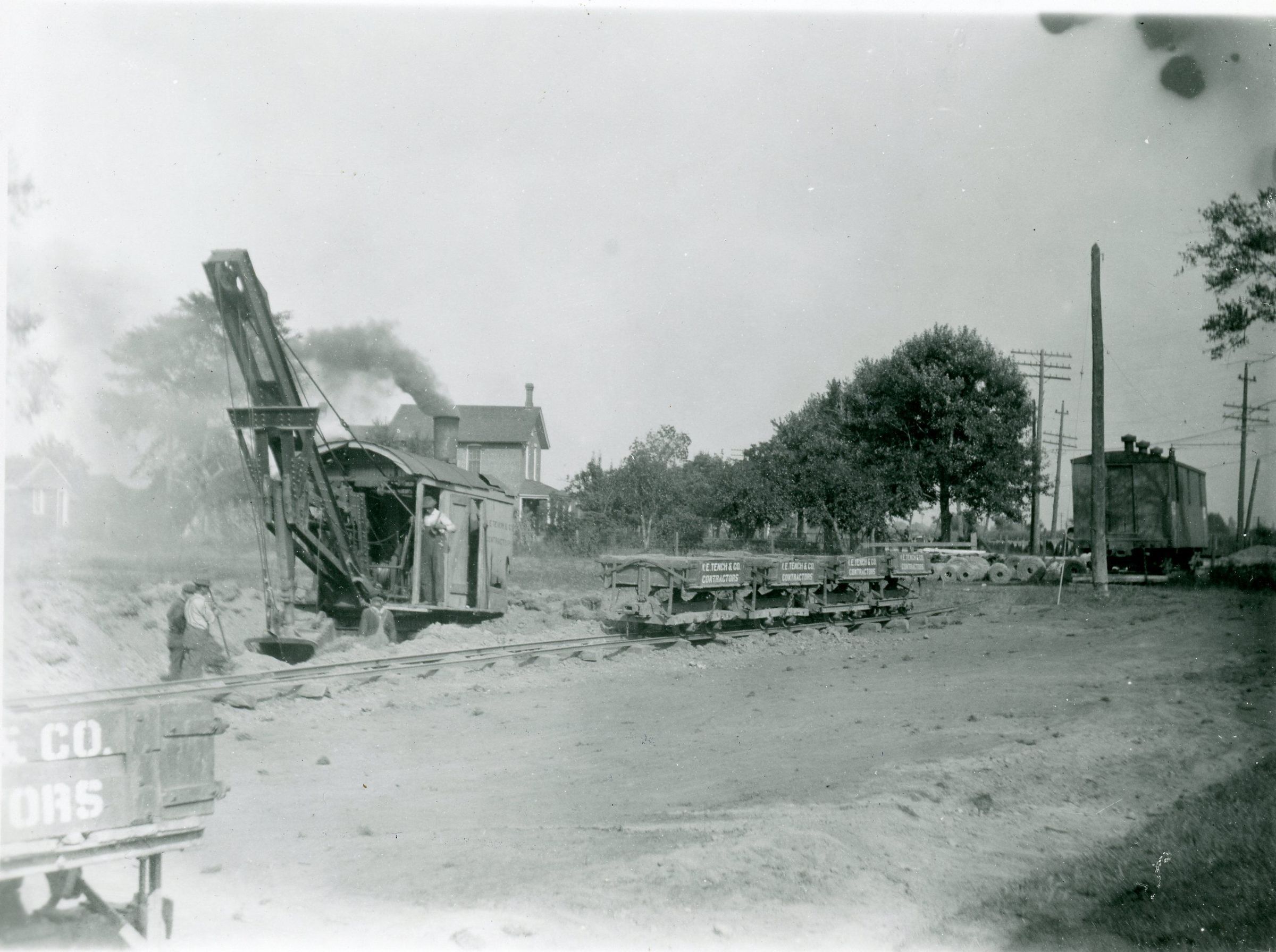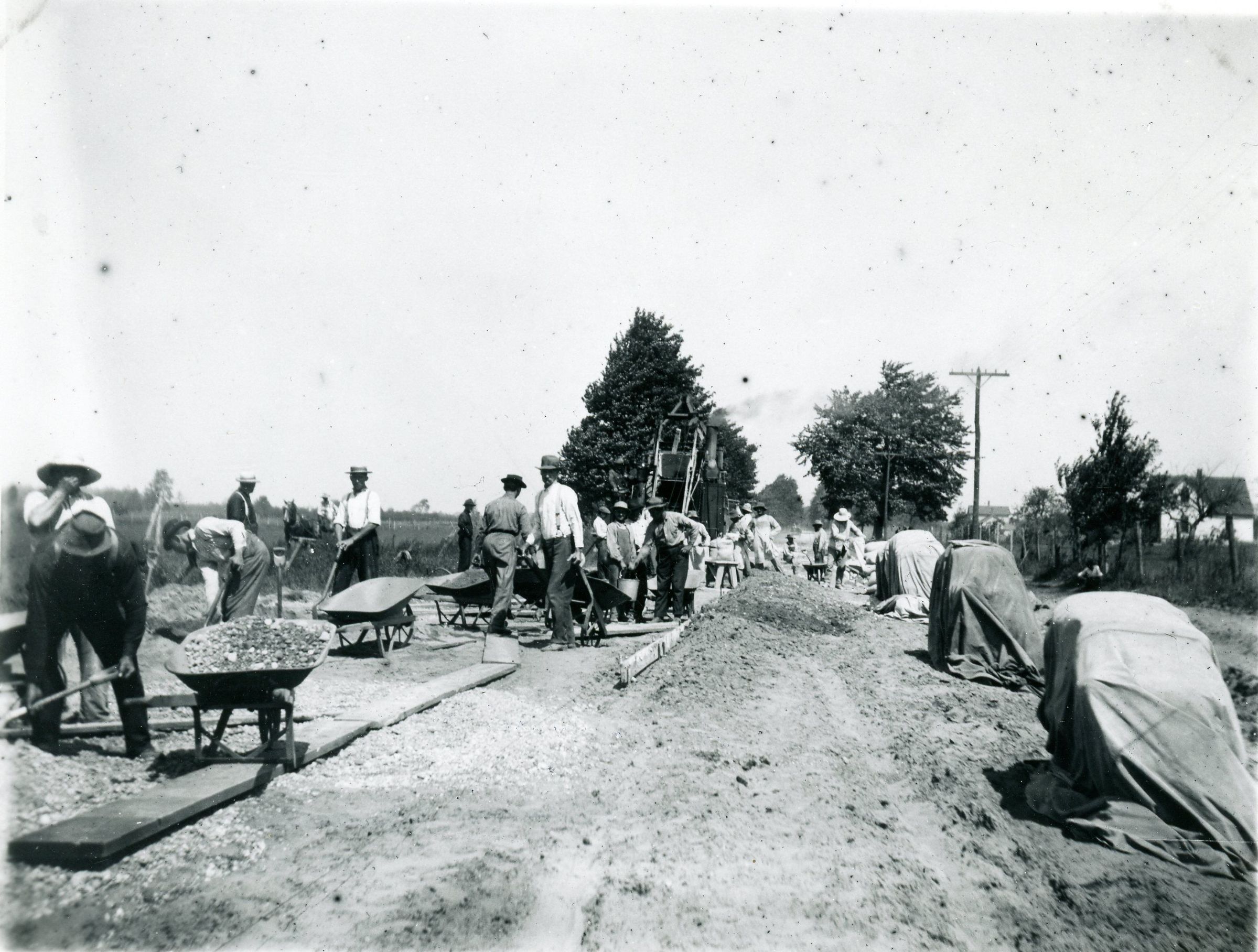 Paving Michigan Avenue 1913. First pavement on Michigan Ave. T.E. Fench Contractors. D.U.R. Streetcar tracks visible.