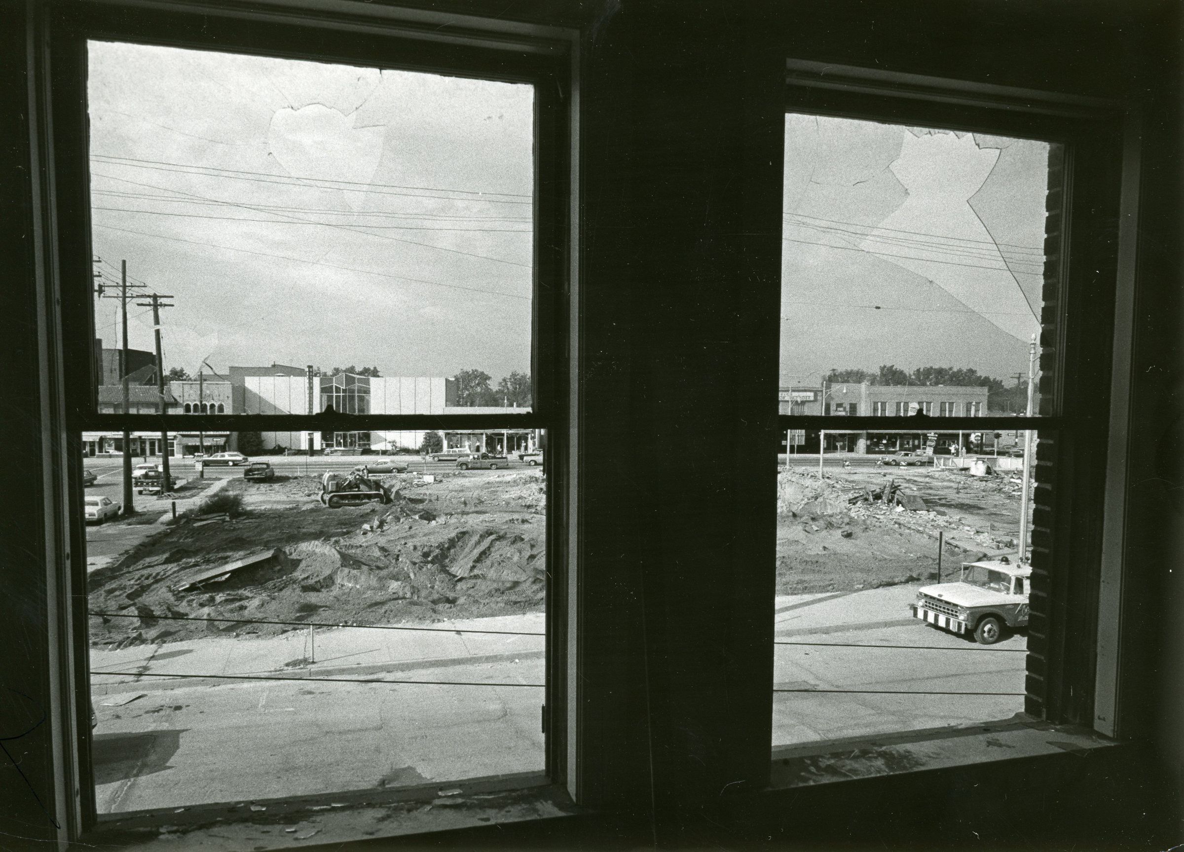 Looking North towards Michigan from Lee Gerbstadt Building, September 16, 1971. Urban Renewal. Eagle Photos. Taken from Lee-Gerbstadt building while being demolished. Open lot where Hoops building was.Cataloged By