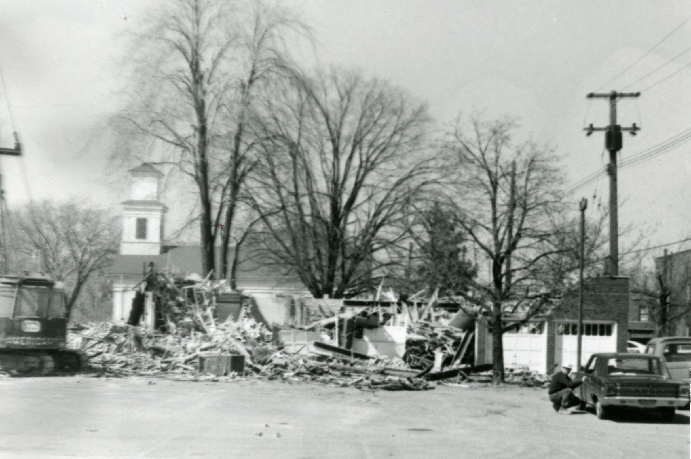 Uht's old funeral home building on Main St., demolished for Urban Renewal. Congregational Church in background.