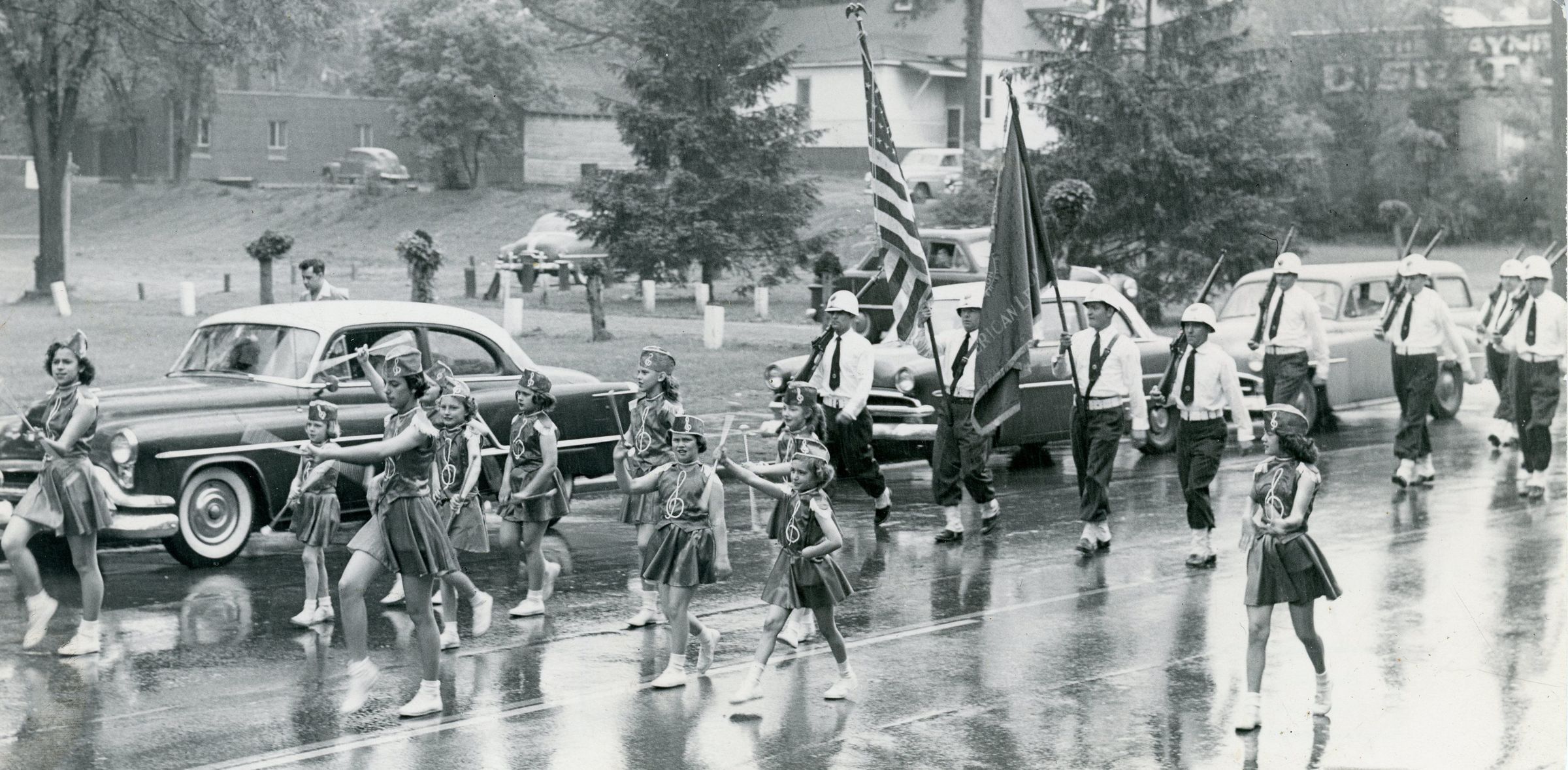 Memorial Day Parade 1955. Wayne road in front of Goudy Park. Sharon Browns Baton Twirling class in front, American Legion Drill Team in back.