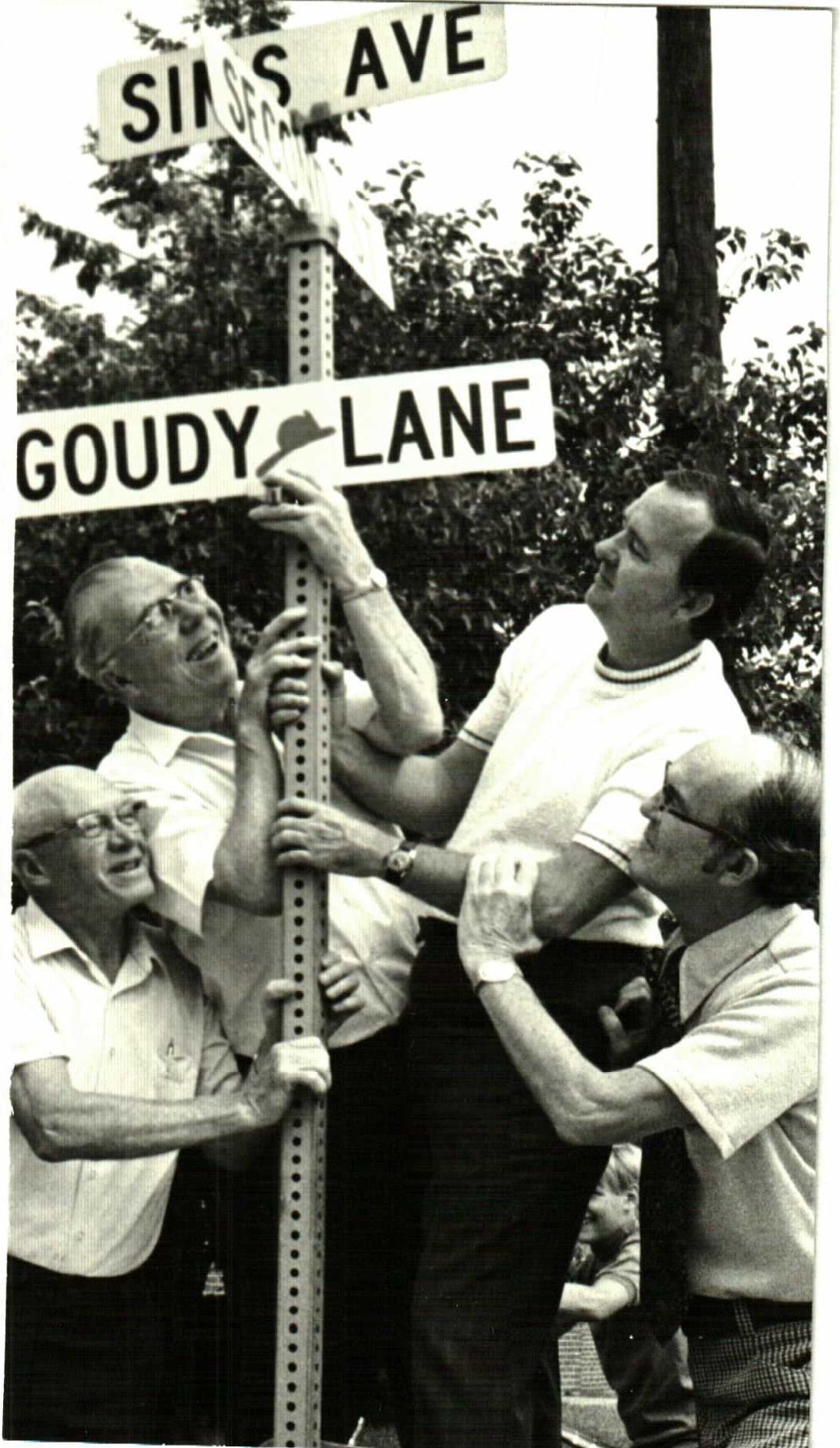 "Goudy Lane" on Sims Street. City officials temporarily name Sims Street "Goudy Lane" in appreciation for Hank Goudys service to the community. Pat Norton, Walter Arrowsmith at right.Cataloged By