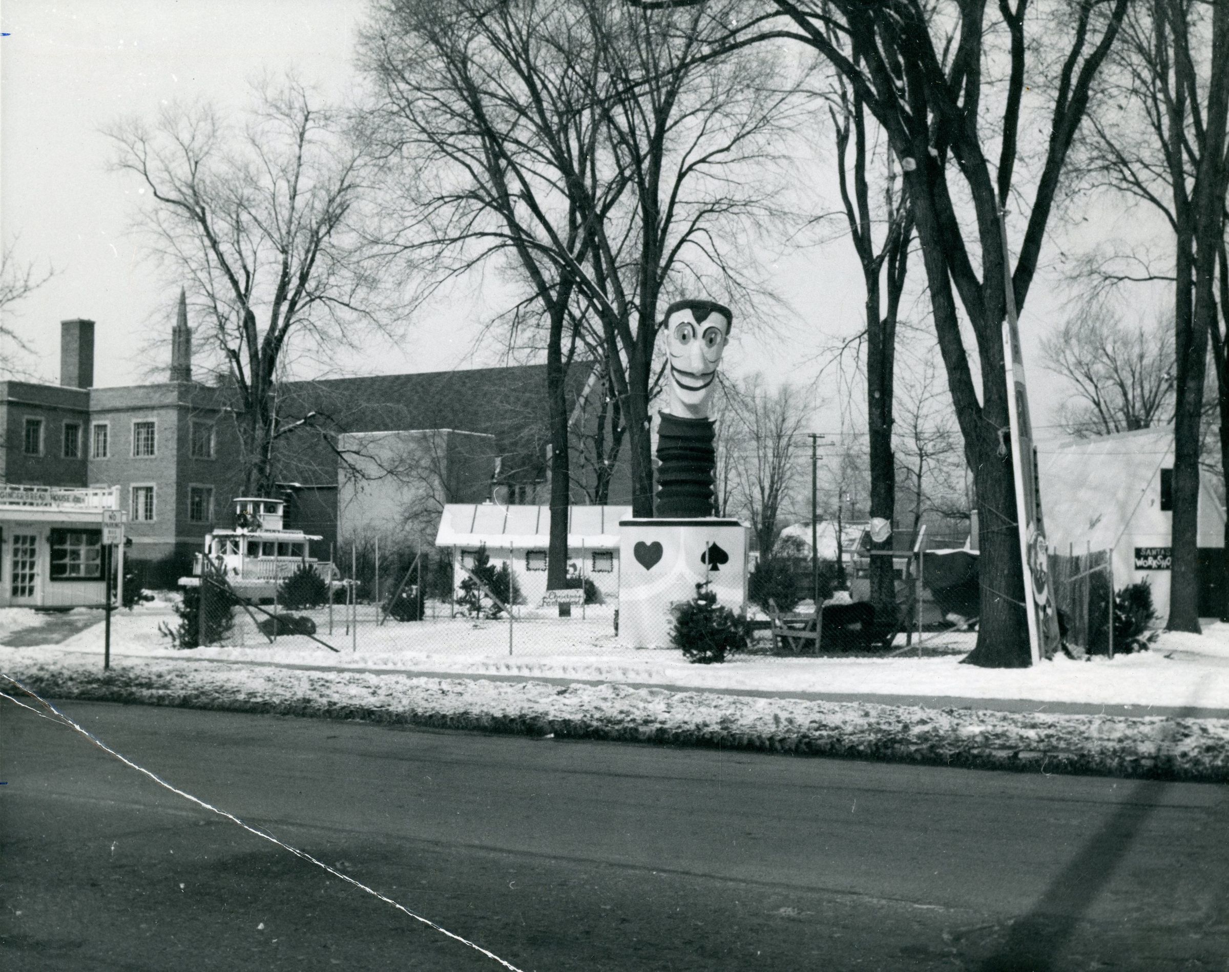 Santa Fairyland in Park, NW corner of Main and Biddle. Methodist Church in background. Project run by Jaycees. Snow, winter scene.