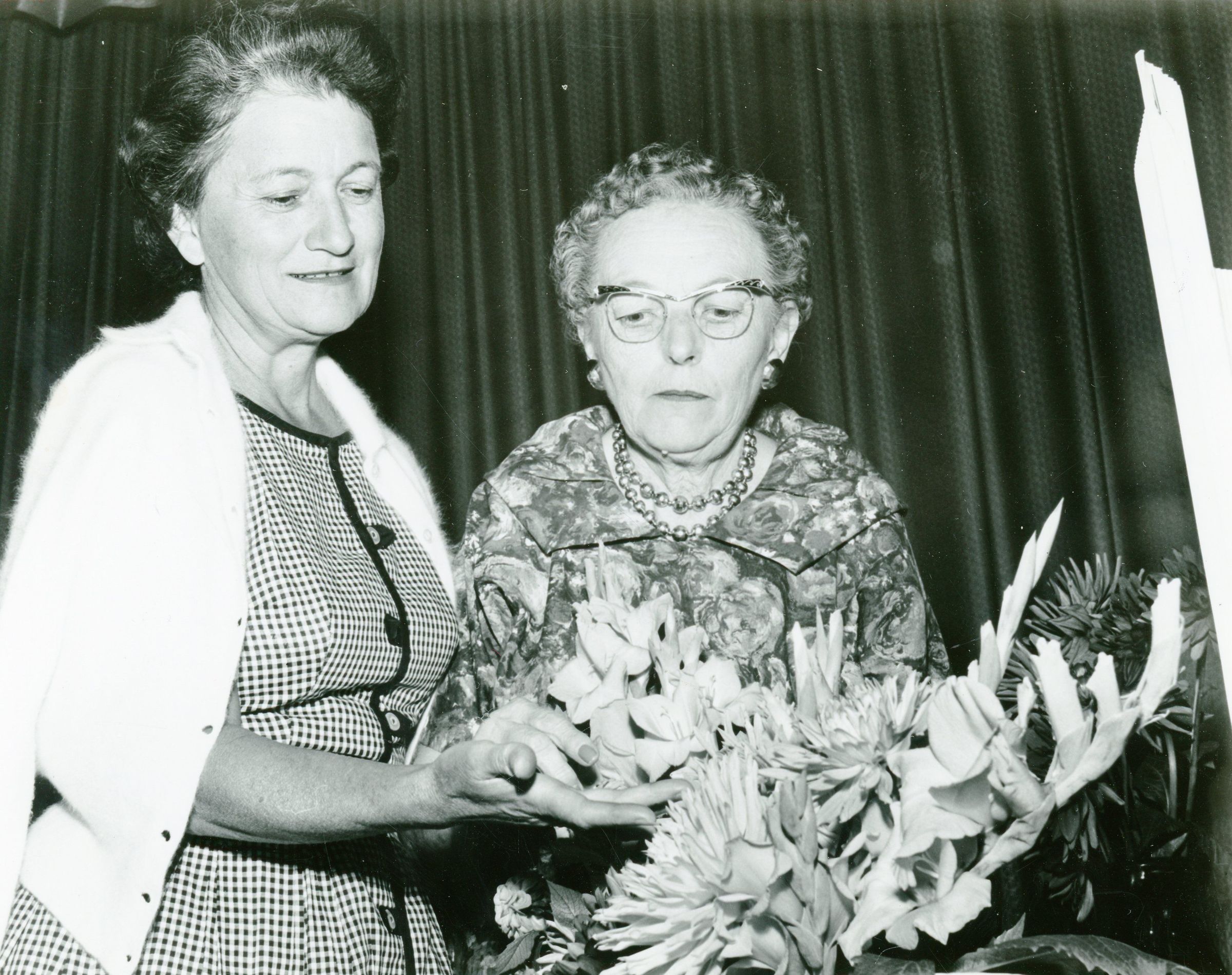 Catherine Krueger and Mrs. Joel Wolfe at the flower show.