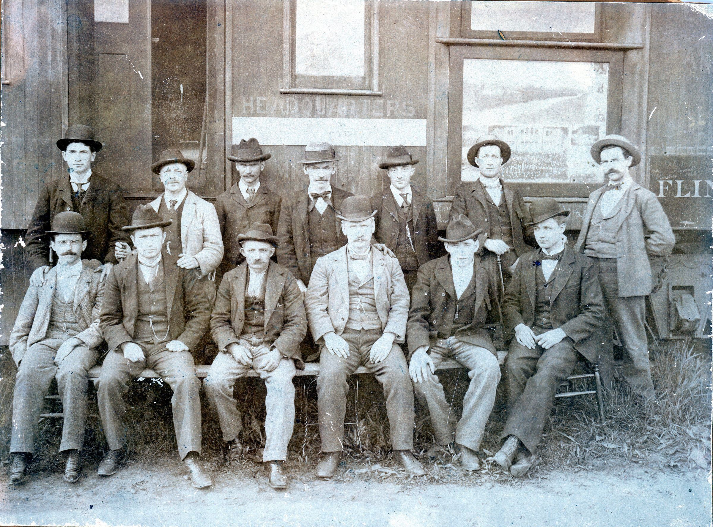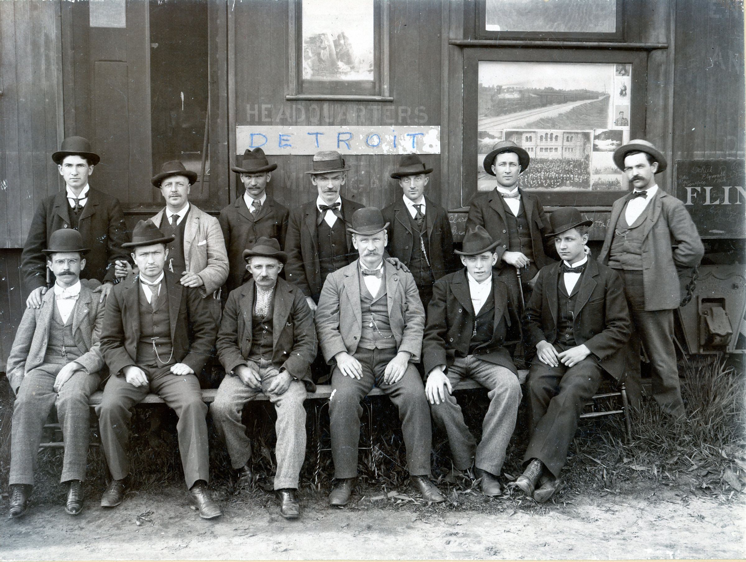 Michigan Central Freight Office Workers. Back Row: (L-R) Ed Cullen, Charles Hasty, Charles Schaffer, Jim Fitzgerald, Will Crane, Harry (Lon) Peters, Hebe Collier. Front Row: Unknown, James Wright, V.E. Hill, Charles Scott, Mr. Groscuff, Will VarneyCataloged By