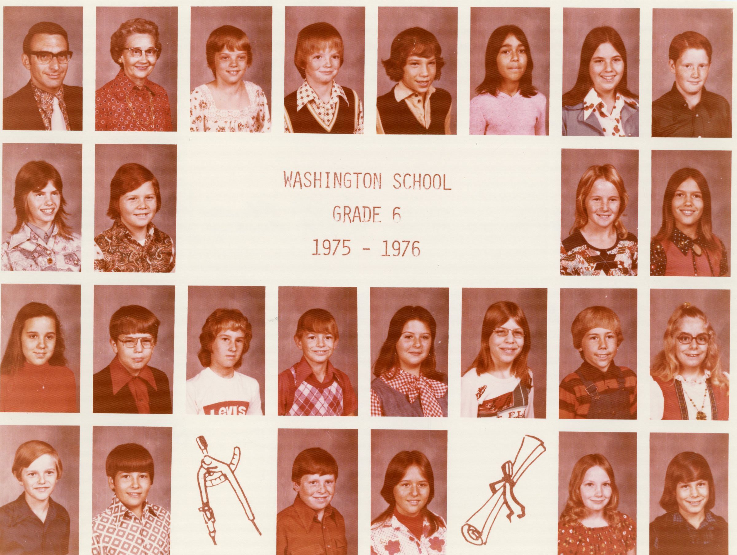 Washington School 6th grade 1975-76 (L_R) Mr Don massey (Principal), Myrna Smeltzer (Teacher), Mary Jo Mason, Kevin McKee, Patrick "Rick" Blake, Gina Ciaraveno, Barbara Dobozy, Reavis Olive. Kitrina Caruso, Tony Sablowski, Diane Brown, Karen Rice. Lauri Harrison, Ivan Hall, Tim McGowan, Mike Lovitt, Linda "Polly" Nichols, Rhonda Cowling, Paul Justice, Vicky Martin. Charles "Danny" Combs, Ronnie Witkowski, David Nicosia, Barbara Cruse, Deanne Grabiec, Robert Cassidy.Cataloged By