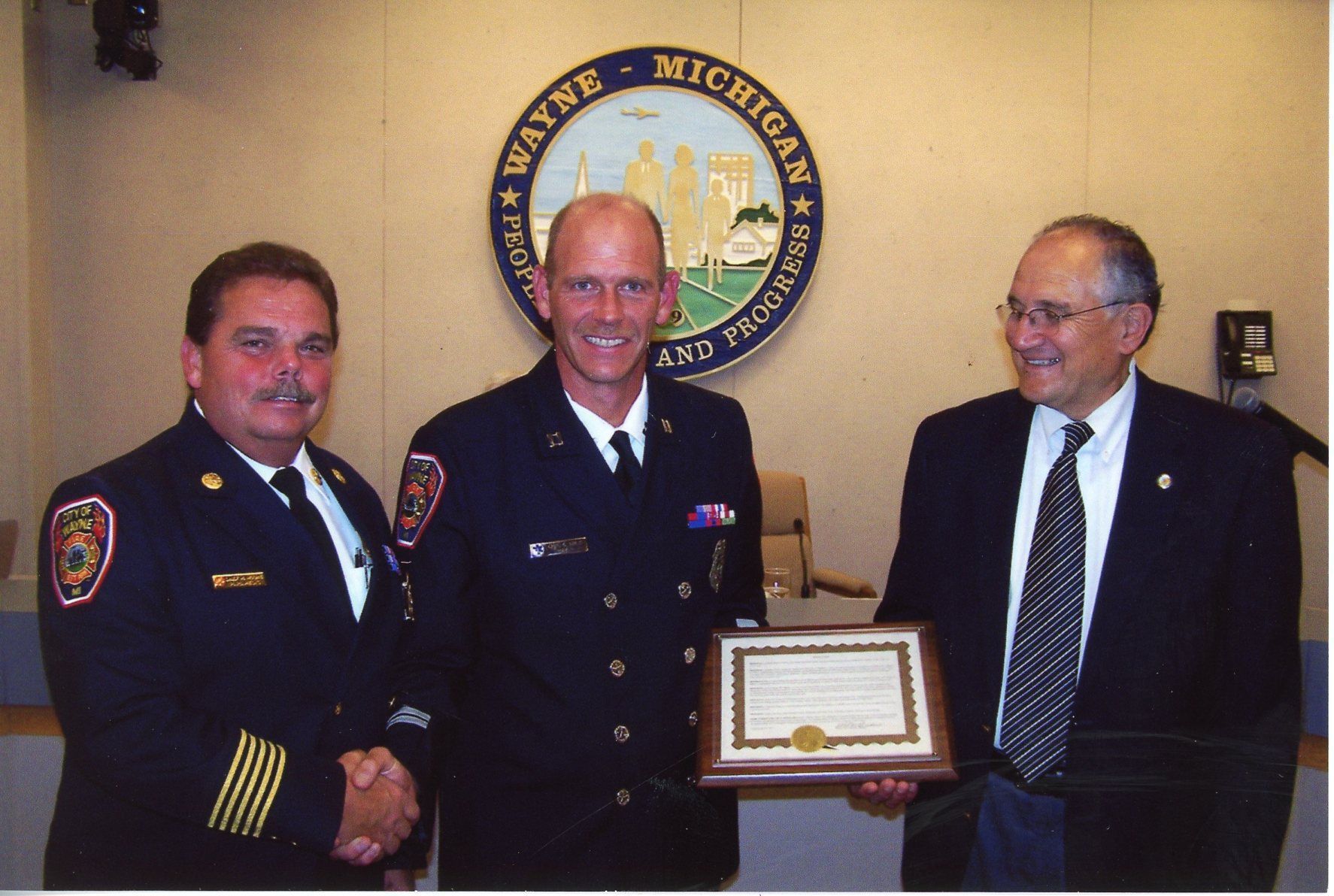 Mayor Al Haidous giving Captain Kenny Hines Firefighter of the year award. WFD cheif More is standing to the left of Kenny. Pic taken in 2011.Cataloged By