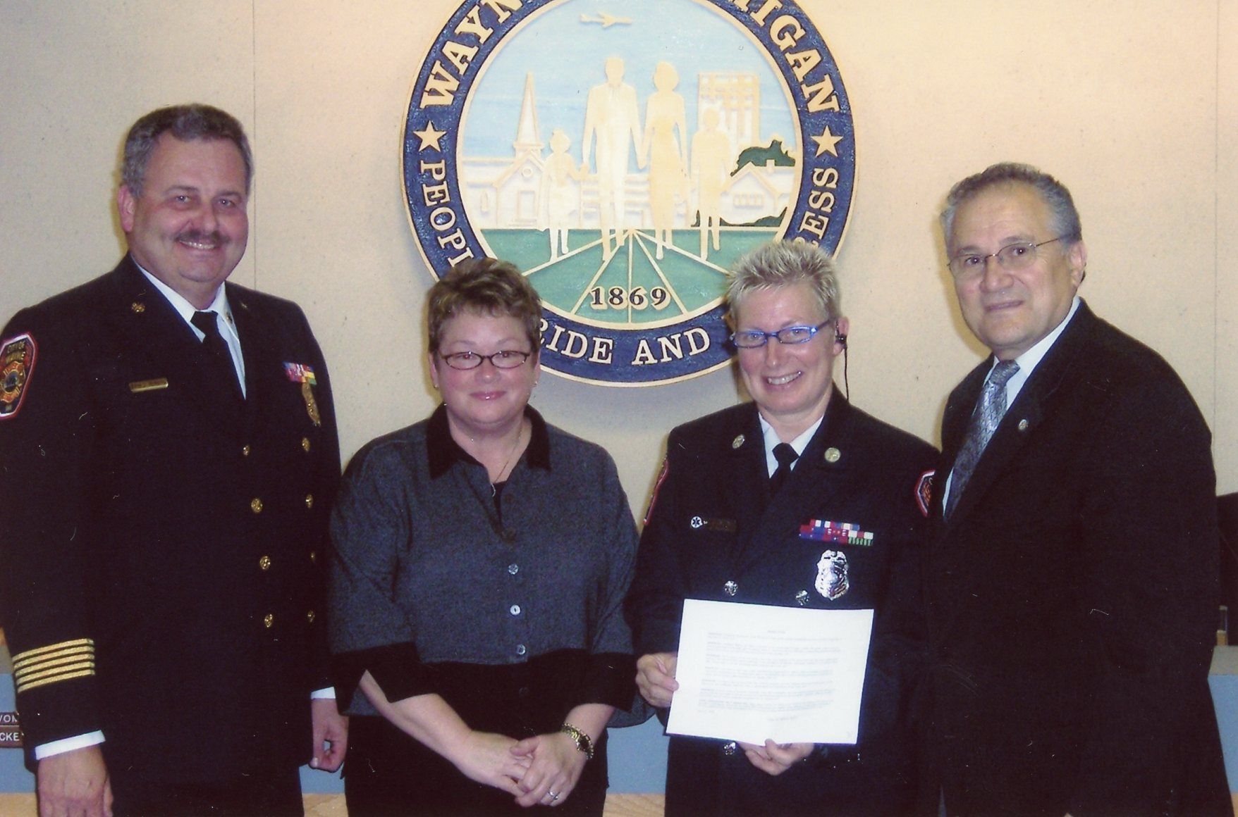 From left to right; WFD Chief Reylords, Unknown, Firefighter Cindy Boring and Mayor Al Haidous.Cataloged By