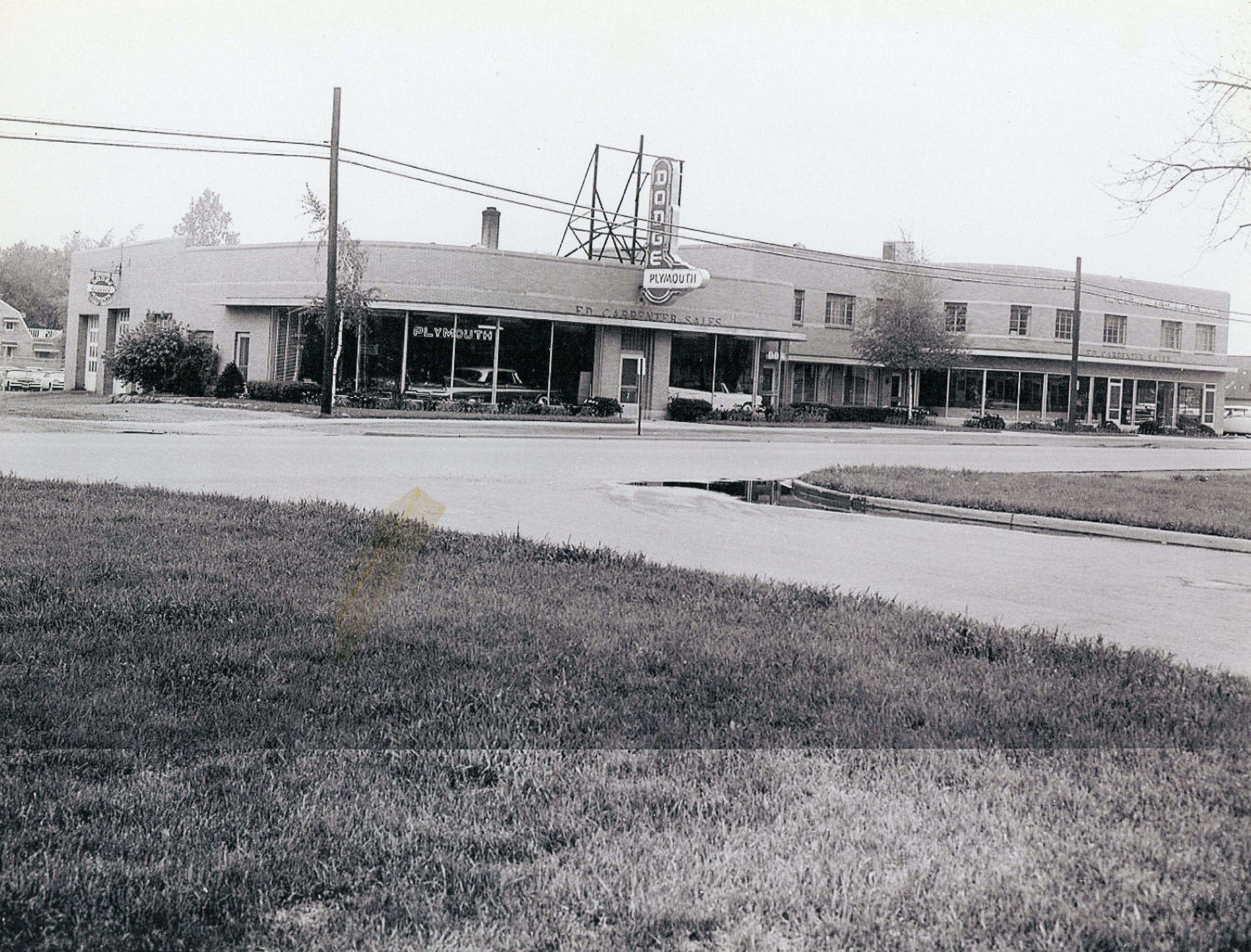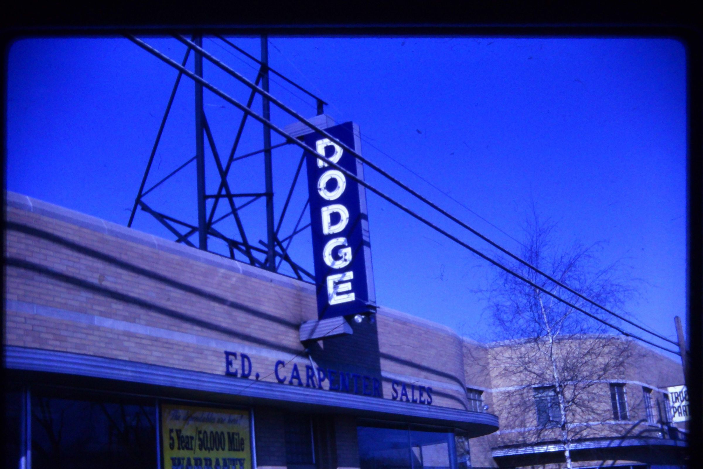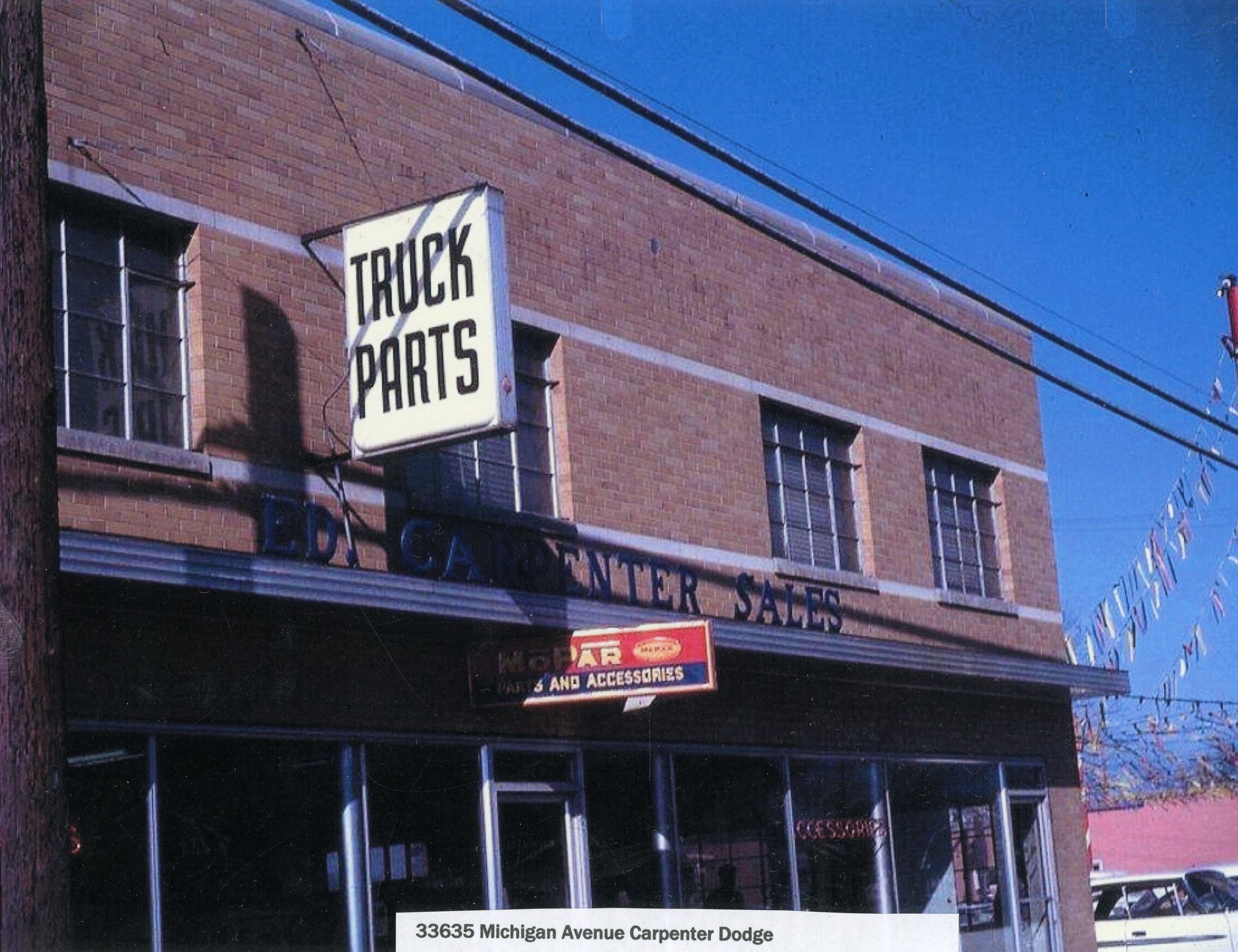 33640 Michigan - Carpenter Dodge Plymouth car Dealership. c. 1956. NE corner Michigan and Josephine. Building still survives as of 2024, but remodeled.Cataloged By