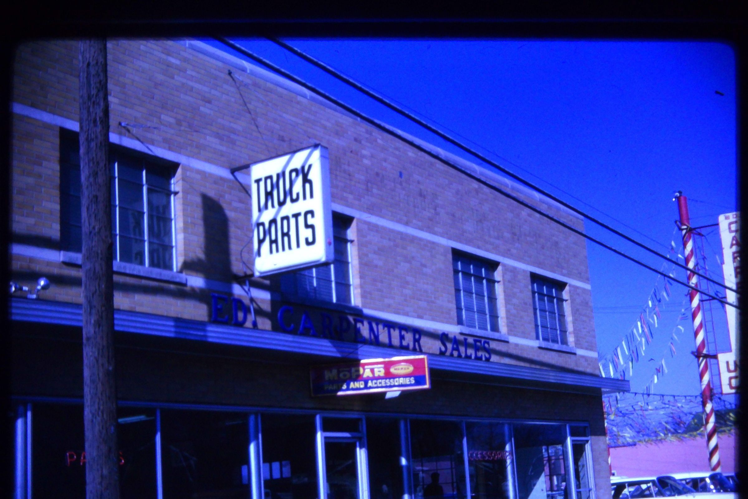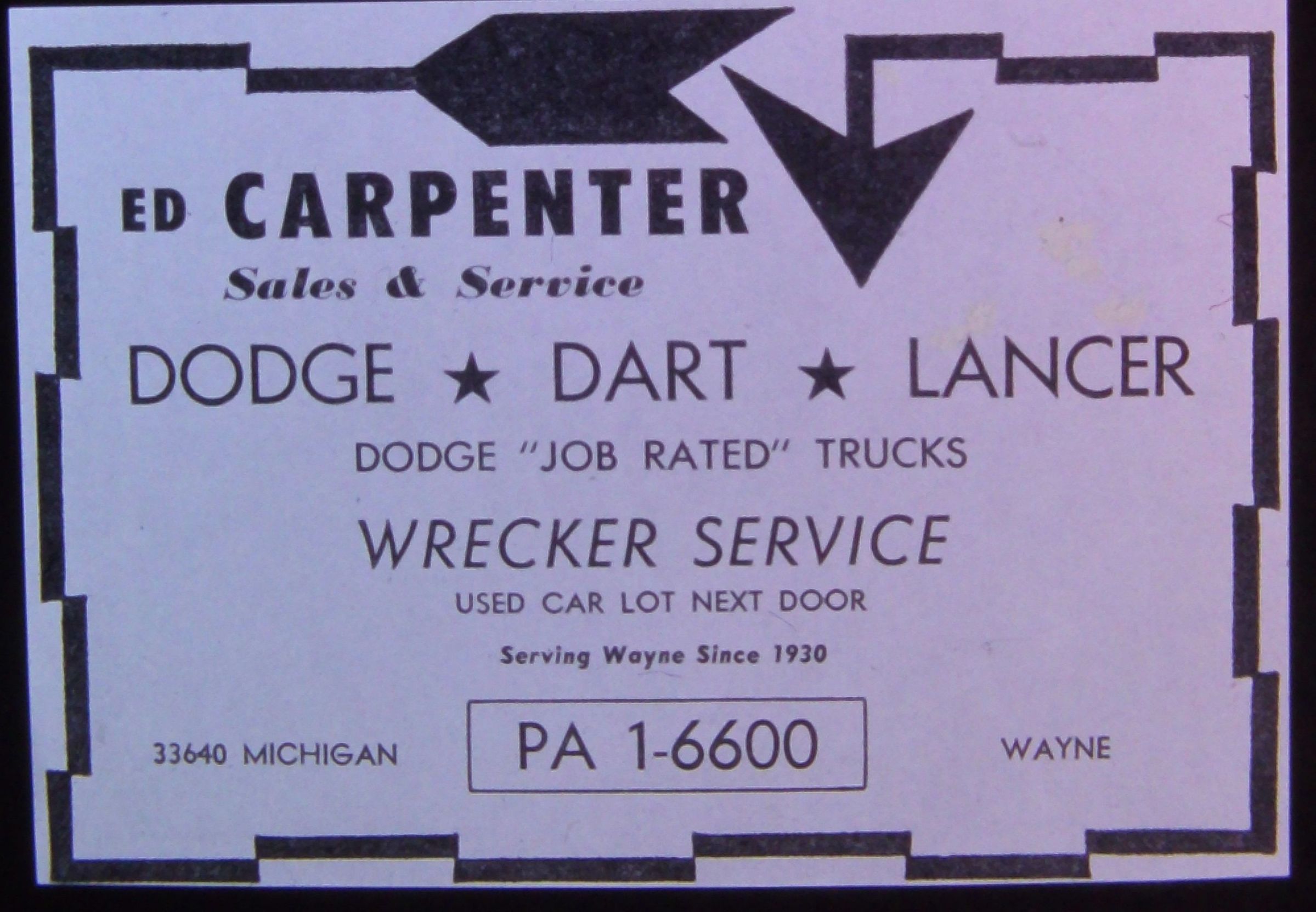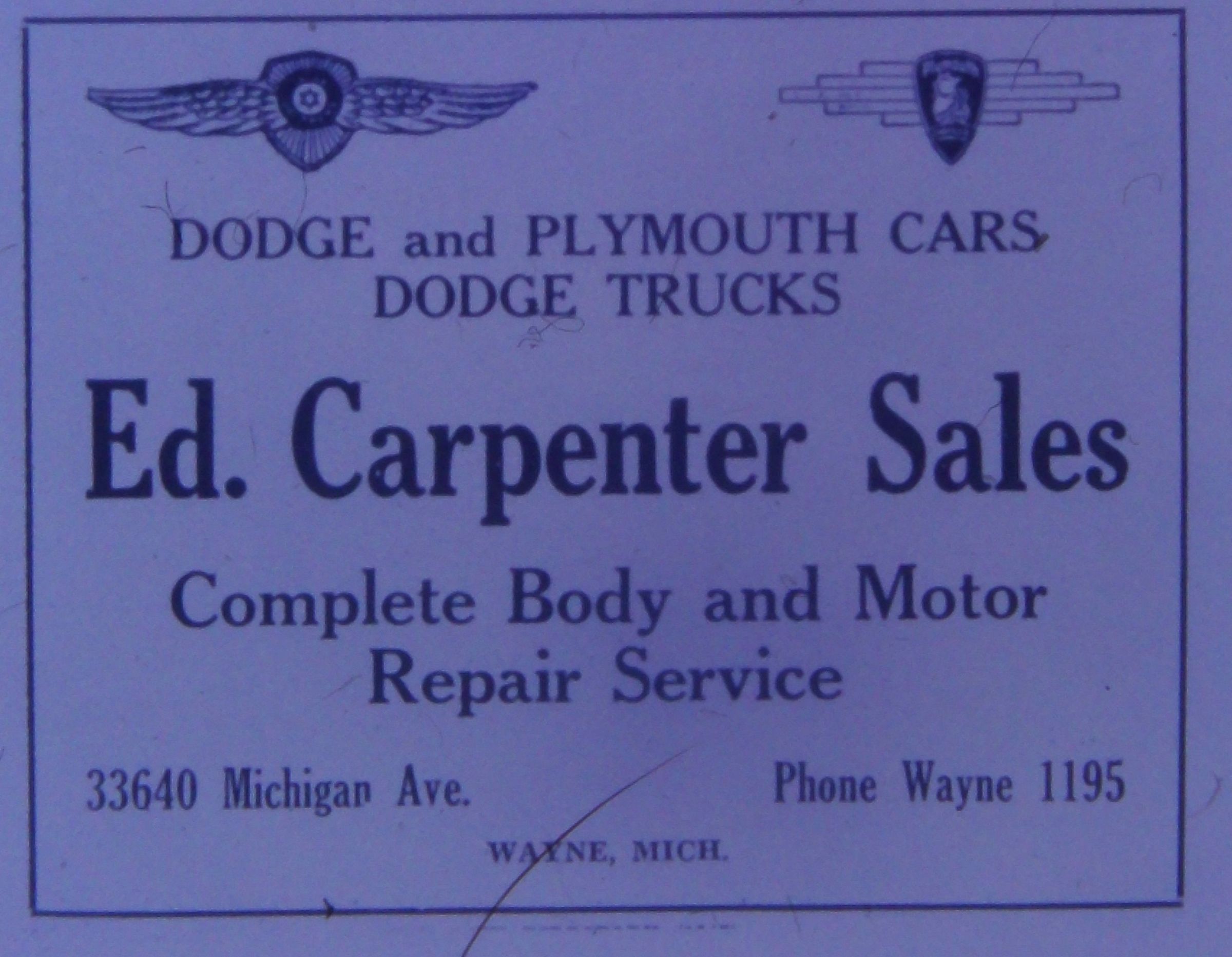 33640 Michigan - Carpenter Dodge Plymouth car Dealership. c. 1956. NE corner Michigan and Josephine. Building still survives as of 2024, but remodeled.Cataloged By