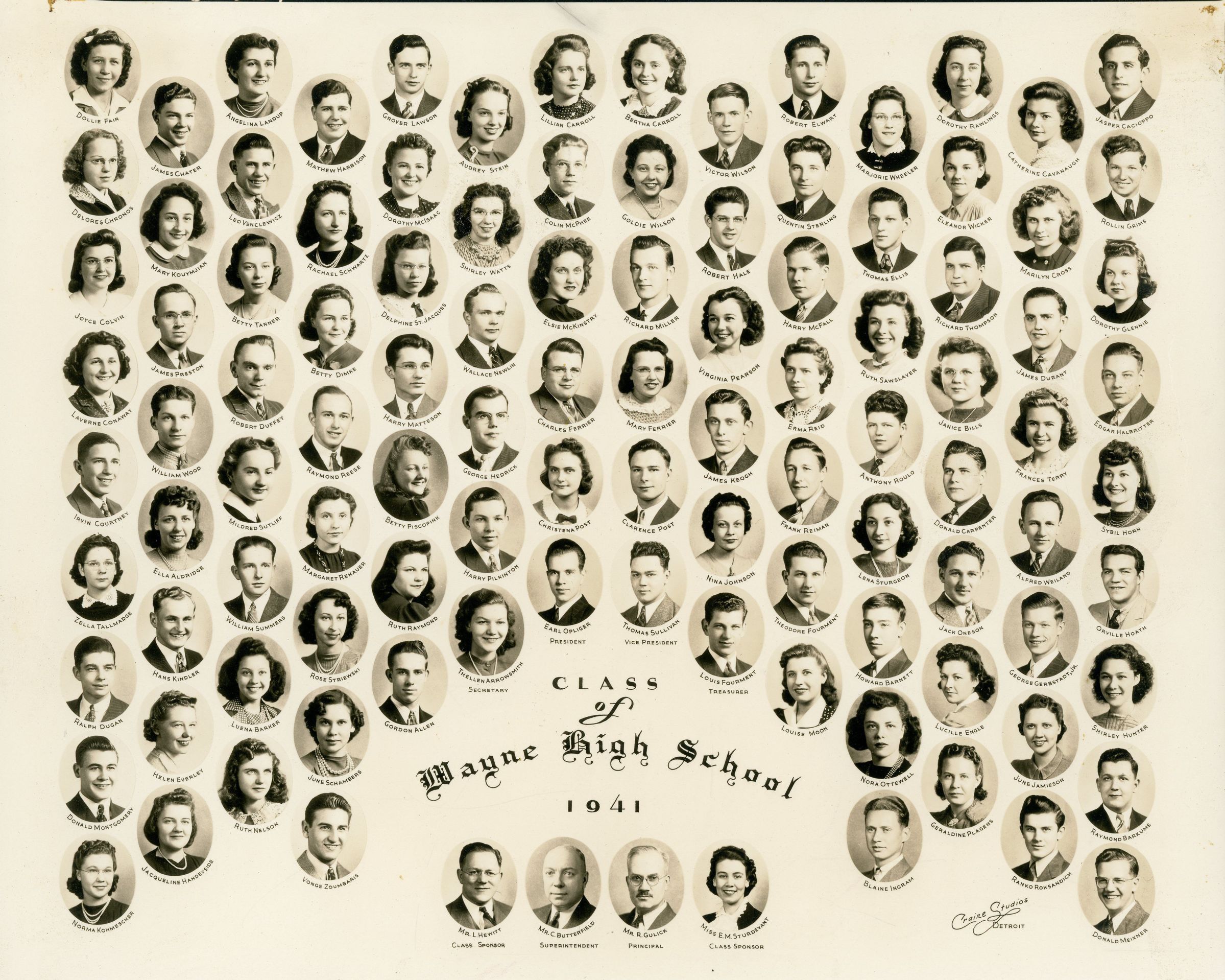 Wayne High School Class of 1941. Top to Bottom Left to Right. Dollie Fair, Delores Chronos, Joyce Colvin, Laverne Conaway, Irvin Courtney, Zella Tallmadge, Ralph Dugan, Donald Montgomery, Norma Kohmescher. James Chater, Mark Kouymjian, James Preston, William Wood, Ella Aldridge, Hans Kindler, Helen Everley, Jacqueline Handeyside. Angelina Landup, Leo Venclewicz, Betty Tanner, Robert Duffey, Mildred Sutliff, William Summers, Luena Barker, Ruth Nelson. MatthewHarbison, Rachael Schwartz, Betty Dimke, Raymond Reese, Margaret Renauer, Rose Striewski, June Schambers, Vonge Zoumbaris. Grover Lawson, Dorothy McIsaac, Delphine St. Jacques, Harry Matteson, Betty Piscopink, Ruth Raymond, Gordon Allen. Audrey Stein, Shirley Watts, Wallace Newlin, George Hedrick, Harry Pilkinton, Thellen Arrowsmith, Mr. L Hewitt. Lillian Carroll, Colin McPhee, Elsie McKinstry, Charles Ferrier, Christena Post, Earl Opliger, Mr. C. Butterfield. Bertha Carroll, Goldie Wilson, Richard Miller, Mary Ferrier, Clarence POst, Thomas Sullivan, Mr. R. Gulick. Victor Wilson, Robert Hale, Virginia Pearson, Jems keogh, Nina Johnson, Louis Fourment, Miss E.M. Sturdevant. Robert Elwart, Quentin Sterling, Harry McFall, Erma Reid, Frank Reiman, Theodore Fourment, Louise Moon. Marjorie Wheeler, Thomas Ellis, Ruth Sawslayer, Anthony Roulo, Lena Sturgeon, Howard Barnett, Nora Ottewell, Blaine Ingram. Dorothy Rawlings, Eleanor Wicker, Richard Thompson, Janice Bills, Donald Carpenter, Jack Onson, Lucille Engle, Geraldine Plagens. Catherine Cavanaugh, Marilyn Cross, James Durant, Frances Terry, Alfred Weiland, George Gerbstadt Jr., June Jamieson, Ranko Roksandich. Jasper Cacioppo, Rollin Grims, Dorothy Glennie, Edgar Halbritter, Sybil Horn, Orville Hoath, Shirley Hunter, Raymond Barkume, Donald Meixner.Cataloged By