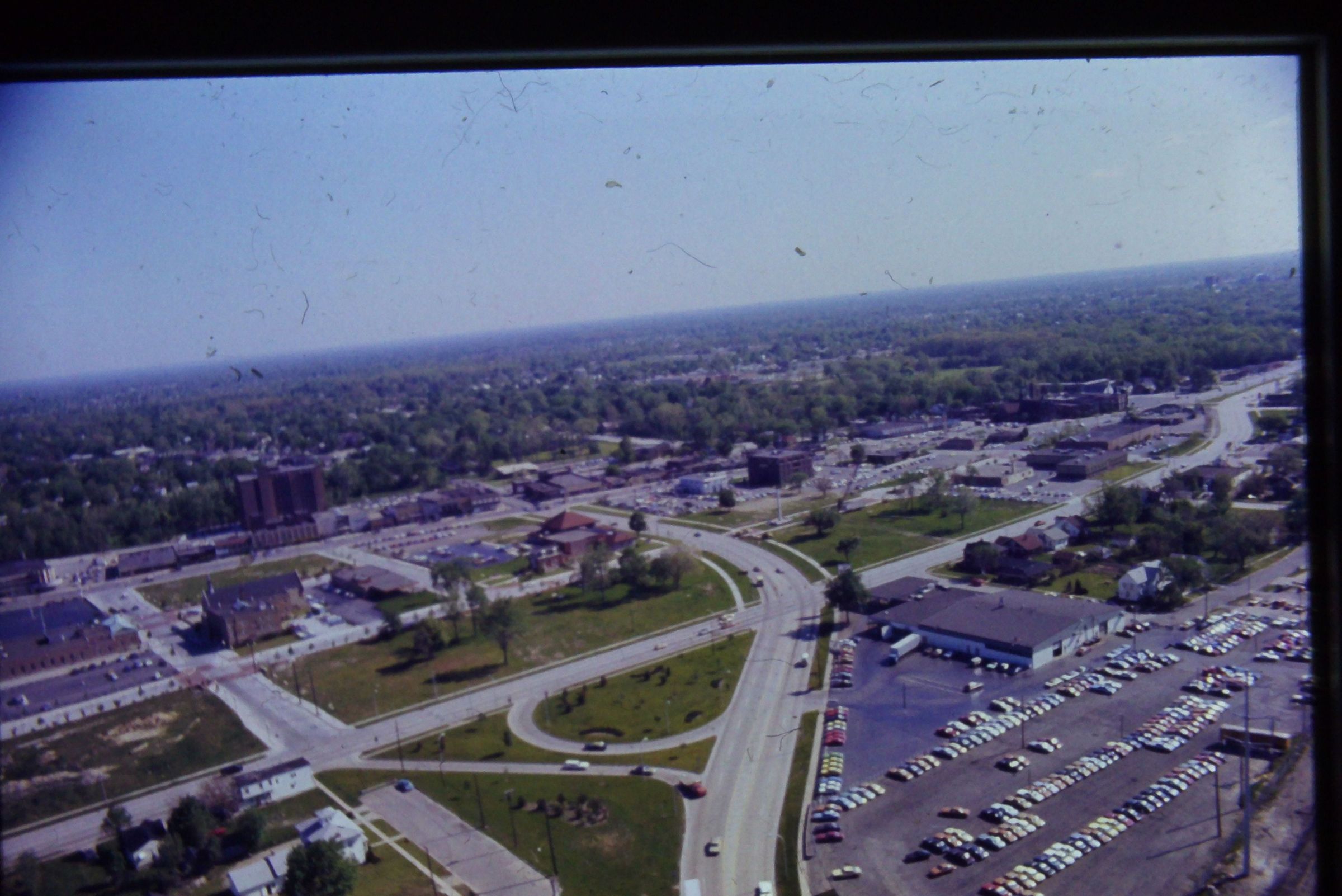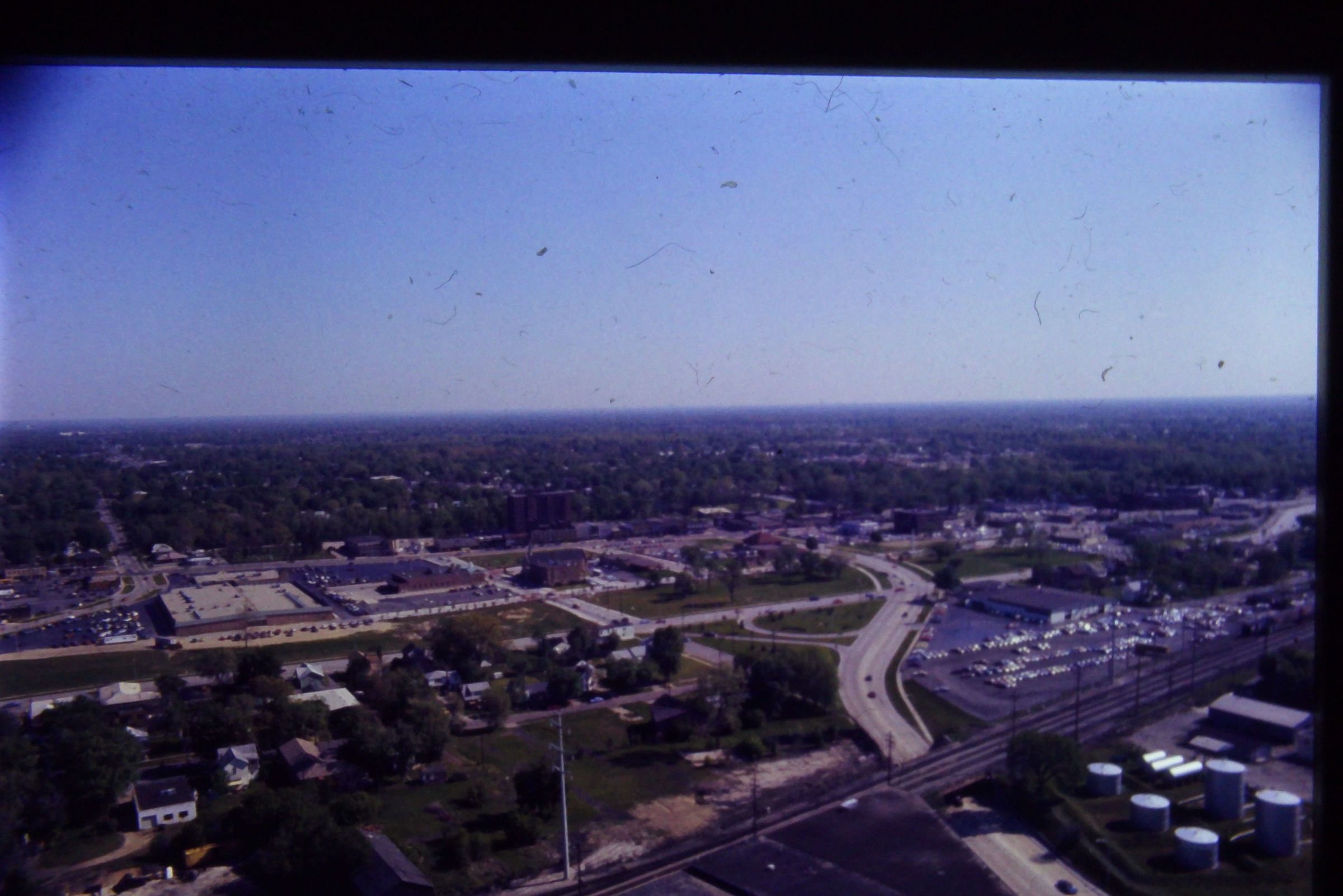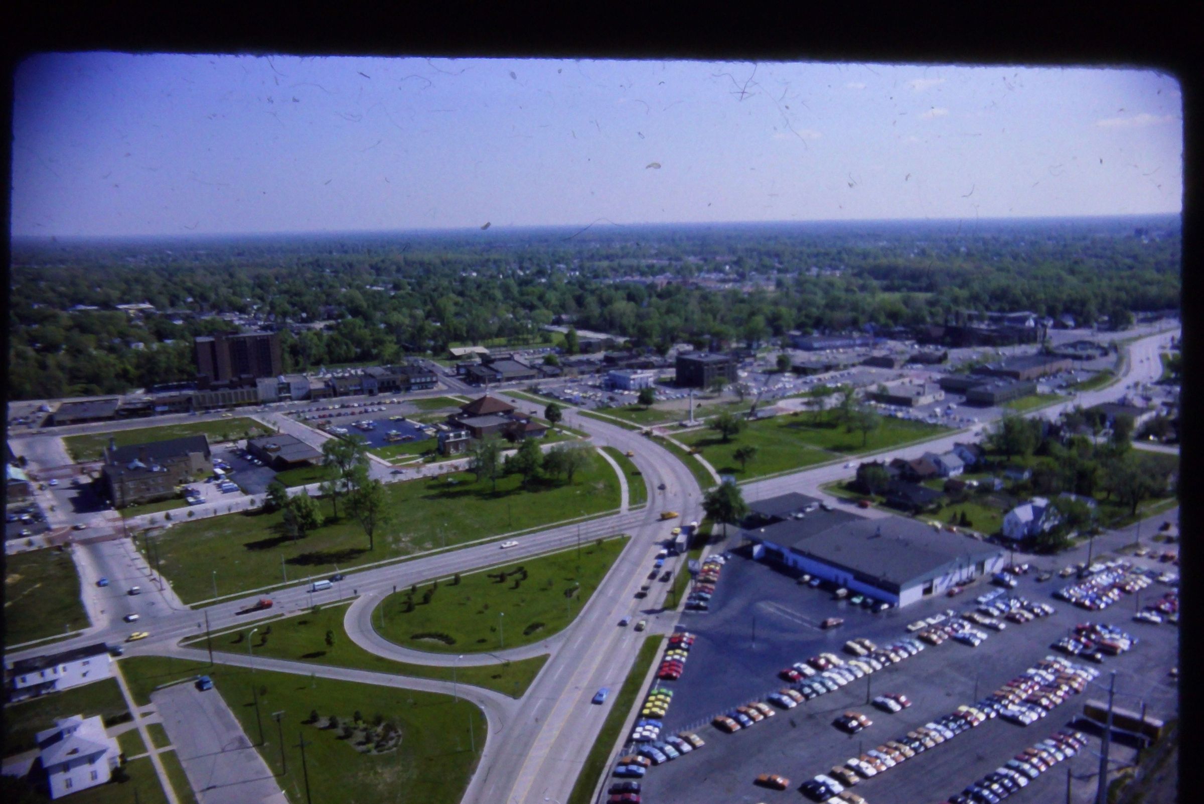 Aerial over Wayne road Curve looking NE. 1970s, post urban renewal.