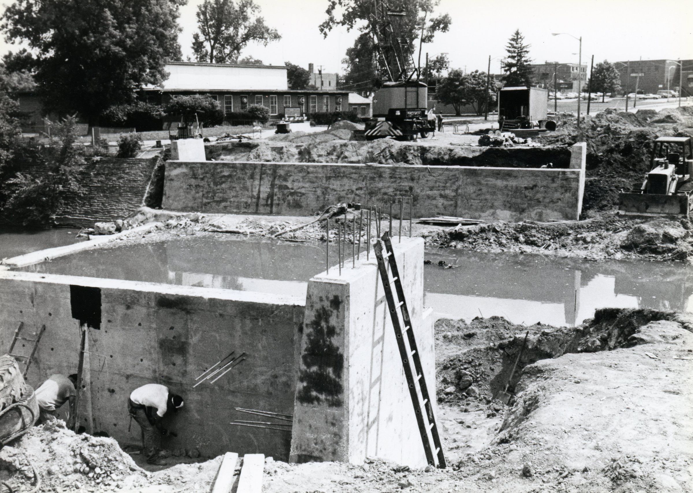 Rebuilding Wayne road Bridge. August 1983. looking South, Old Rec Center on left.