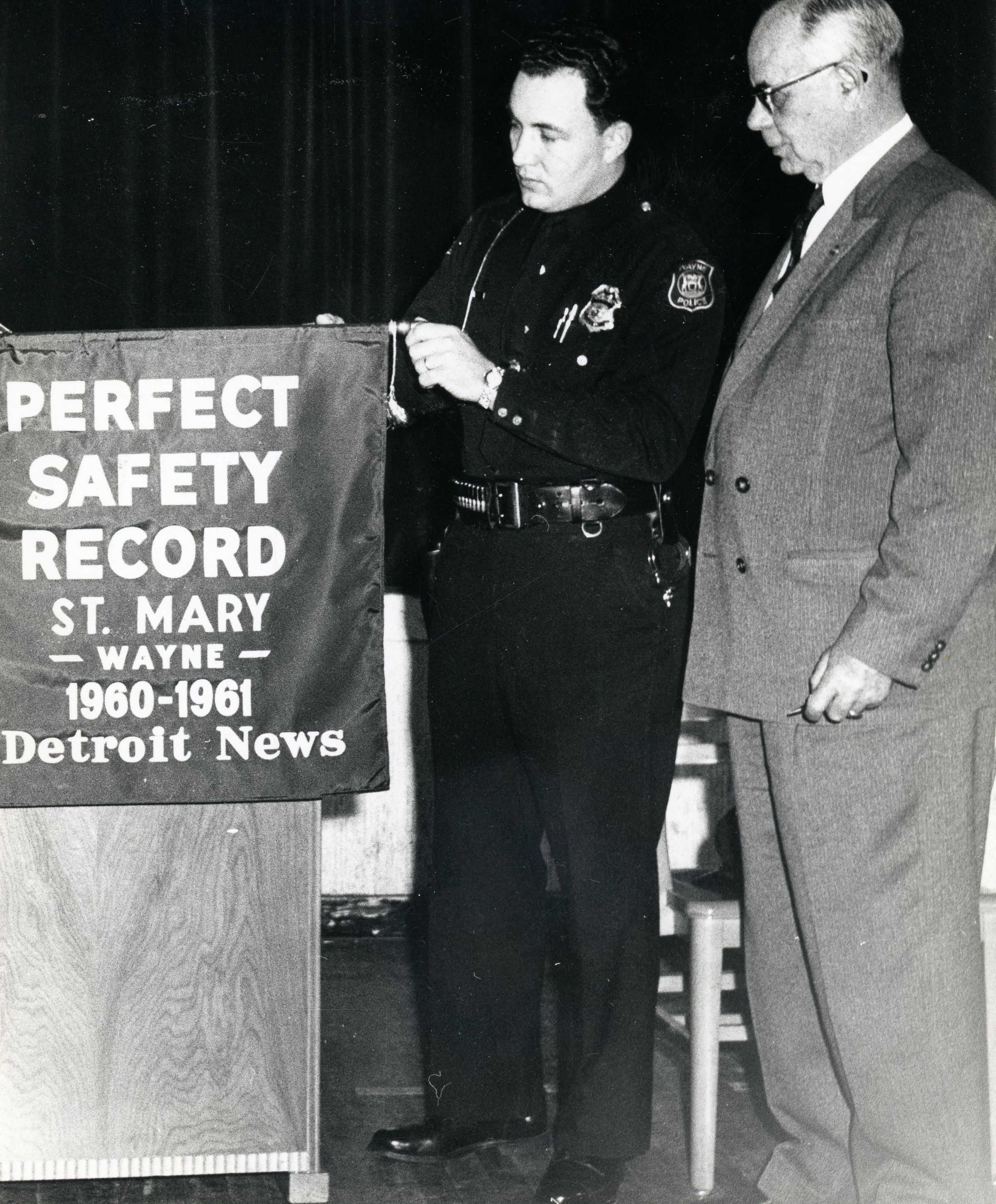 Perfect safety record St. Marys 1960-61 banner. Ray LeCornu, Larry Knox - police chief