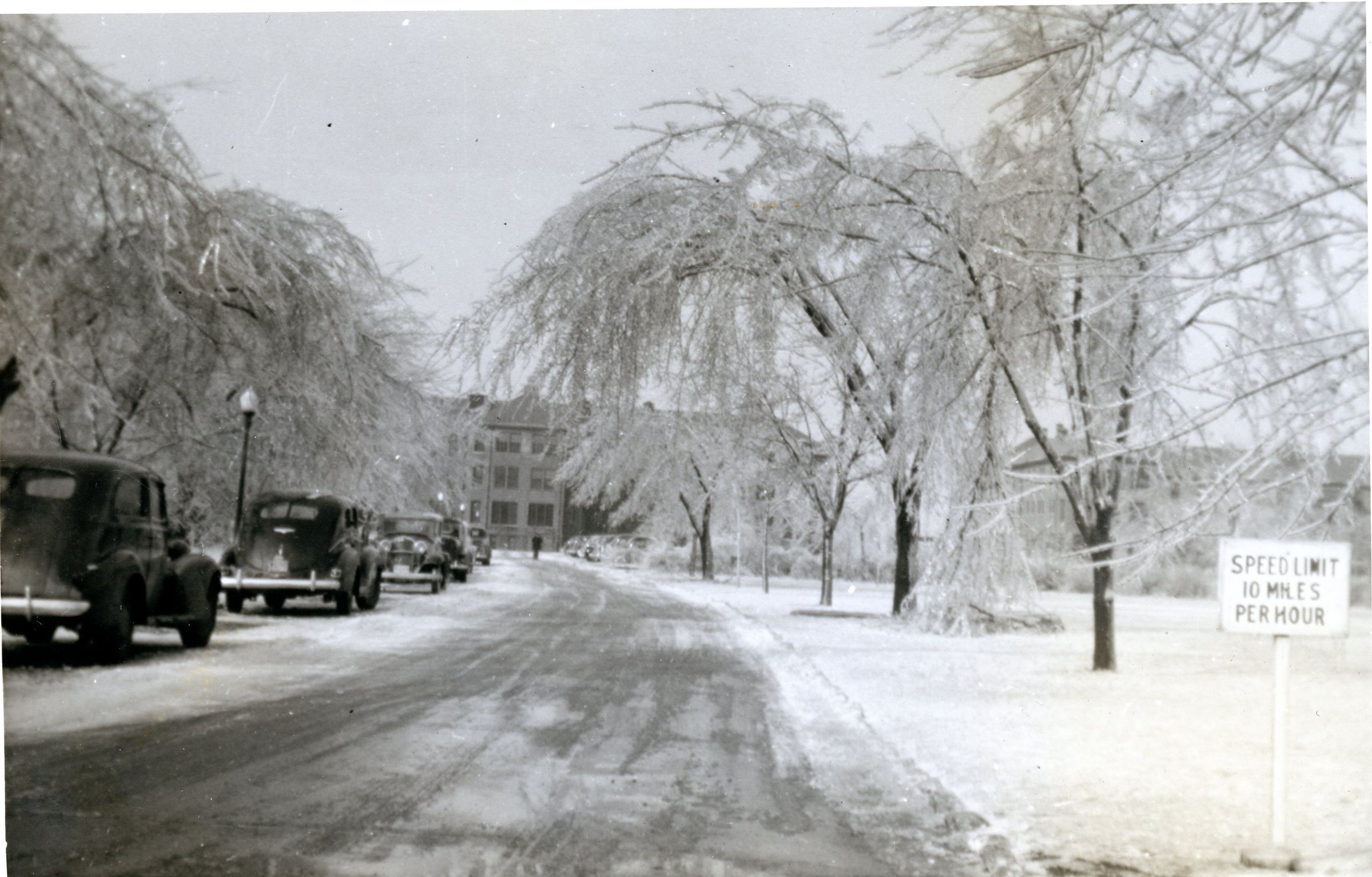 Snowy winter scene with ward buildings in background, likely Eloise