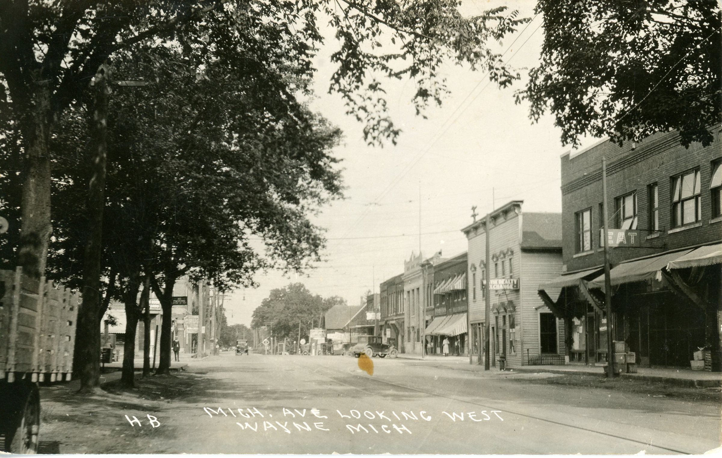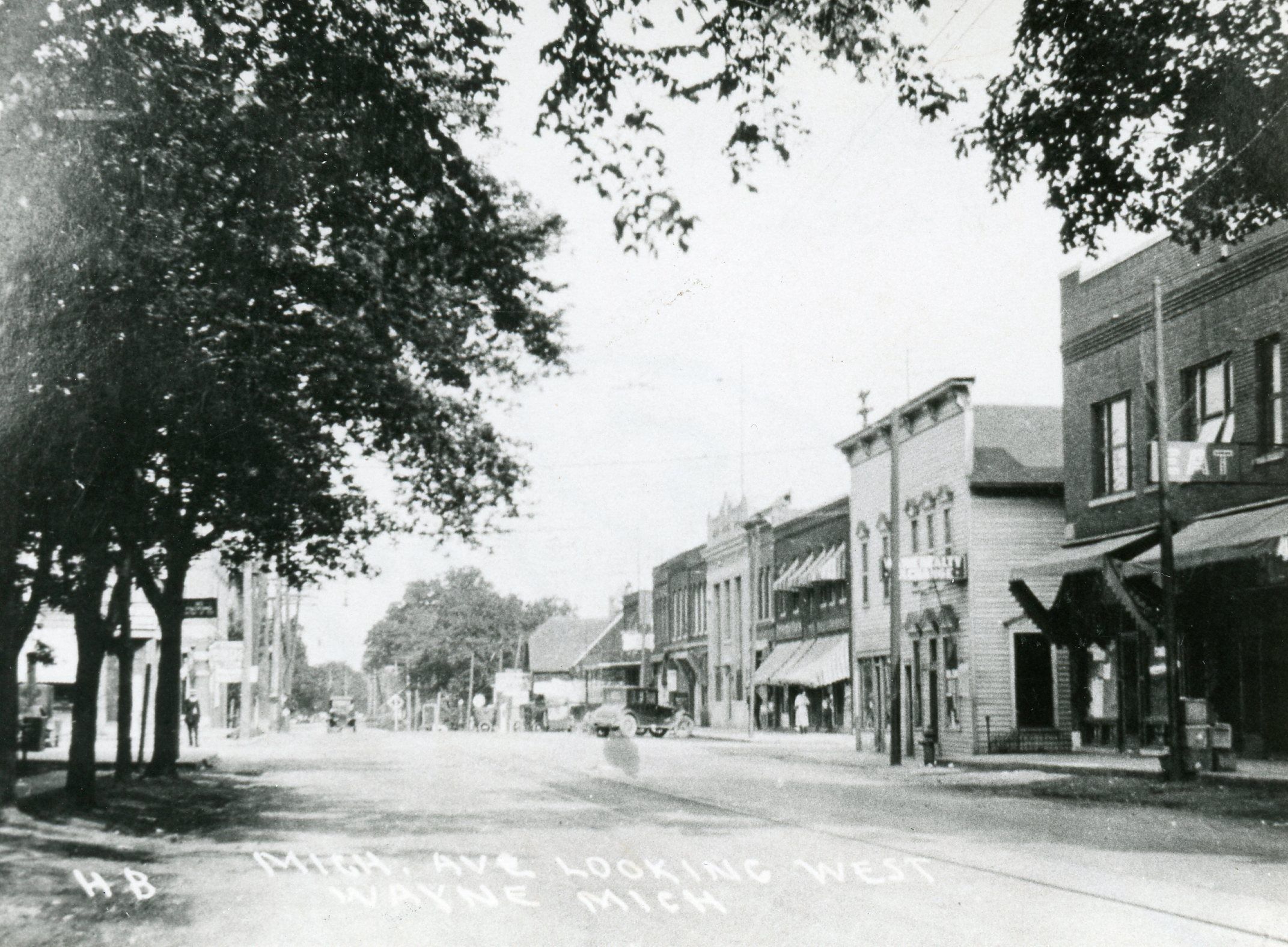 Michigan Avenue looking West towards Wayne road. 1920s. Gerbstadt building on right, then old Varney Zephuss Hotel, Wayne road and Bank Block.Cataloged By