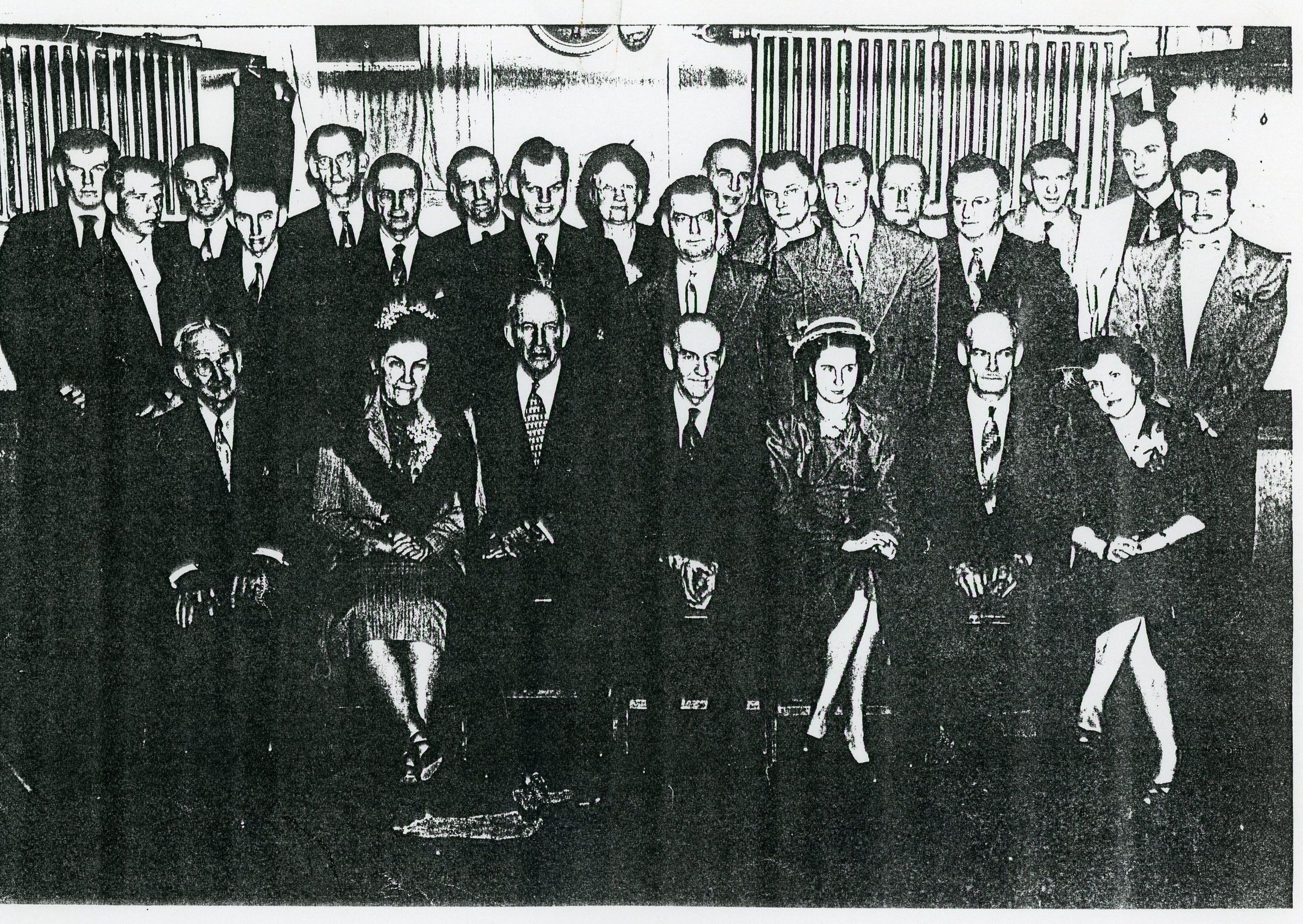 Back 2 rows left to right; Ray Sigworth, Jim Pepper, Harvey Stevens, Irv. Renton Jr., Diek Mayall, Irv. Renton Sr., Stan Durand, Jim Leright, Rose Fulton, Oliver Bunting, Dan Howell PM, Francis Crook, Jim Kingsbury, Fank Haufley, Al Angove, Harold Tennis, Walt Kolomyski and Milan Hively. Sitting; Jim Fergeson, Leona Ryckley, Clyde "Toughey" Frank, Claude Carpenter, Marjorie Rawlings, Harold Jamison and Leora Christie. People Missing our Glen Evans, Clarence Schkofsky and Phill Sheldon.Cataloged By