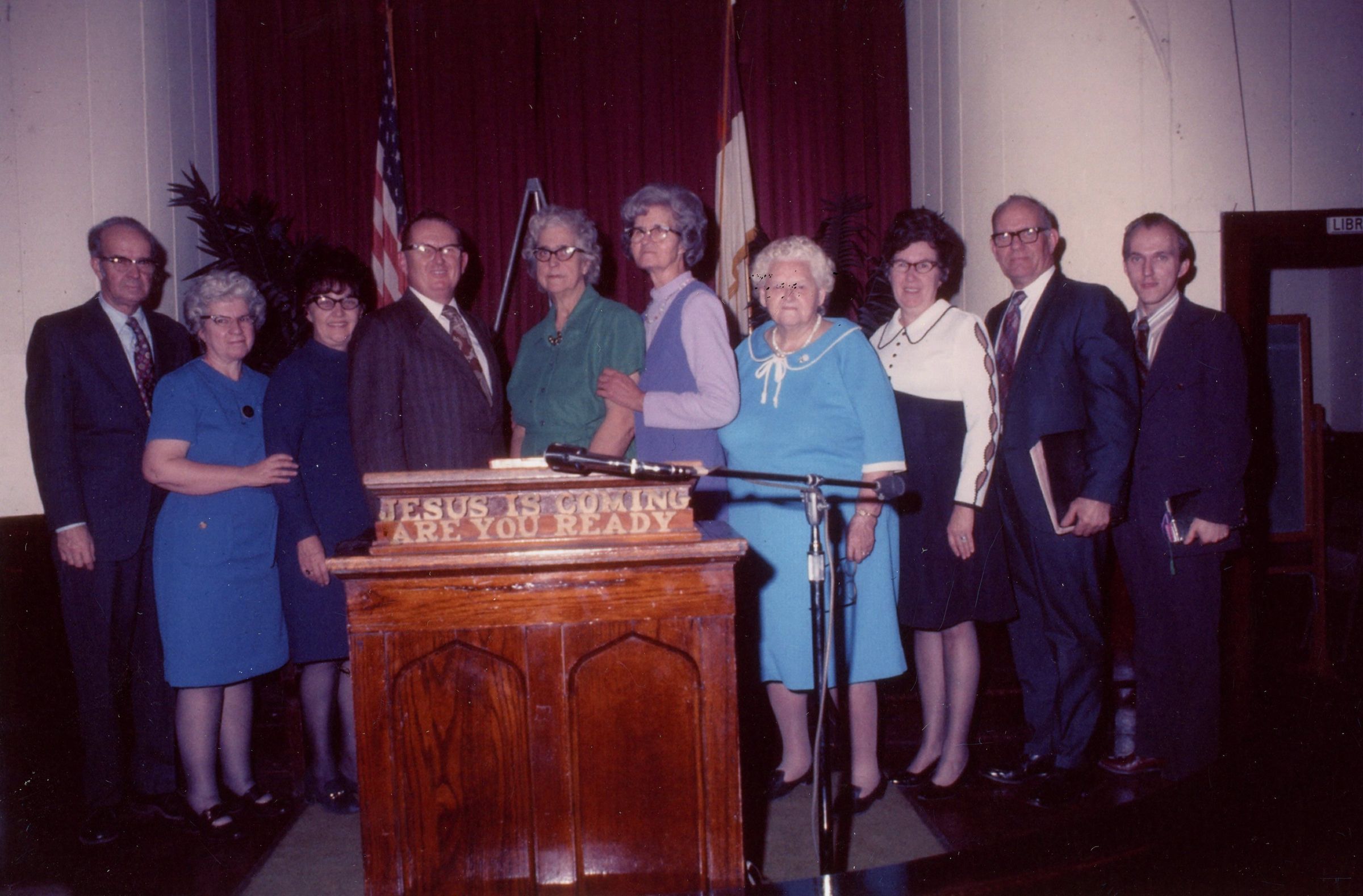 Left to Right - Ralph and Mable Sharp, Pastor Edward and wife Nellie, Mary Baker, Ora Horn, Sister Anderson, Hilda & Harold Linebrink, and son Charles Linebrink