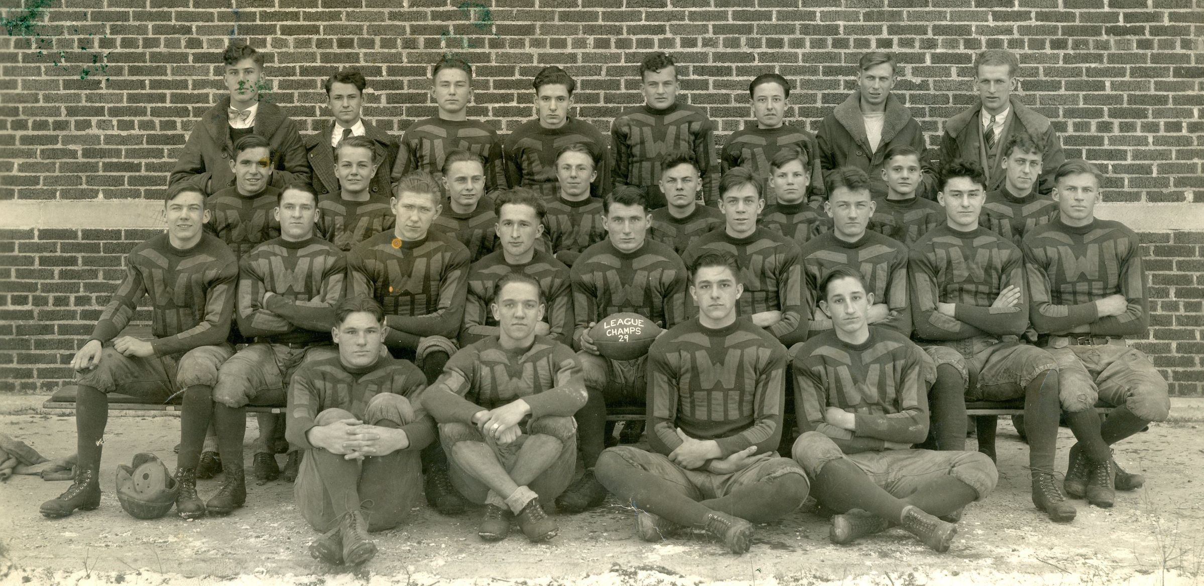 Wayne High School Football Team 1929. Back Row: Hank Goudy, Arthur Cowan, Harold Arvin, Jack Martz, Jack Hargrave, Delbert Heller, Coach Alan Maclean, Assistant Coach Dick James. 3rd Row: Lee Goof, Charles Lents, Glenn Coleman, Steve Yeake., Fred Barchard, Earl Ebans, Hyle Carmichael, William Dittmar. 2nd row: Terrance Worden, George Stellwagen, Glenn Rankin, Frank Houfley, Bernard Bird, Fred Allen, Frank Diehl, Carl Arvin, Justin Emerson. Front Row: Bob Prieskorn, George Russell, Norman Martin, George EnotCataloged By