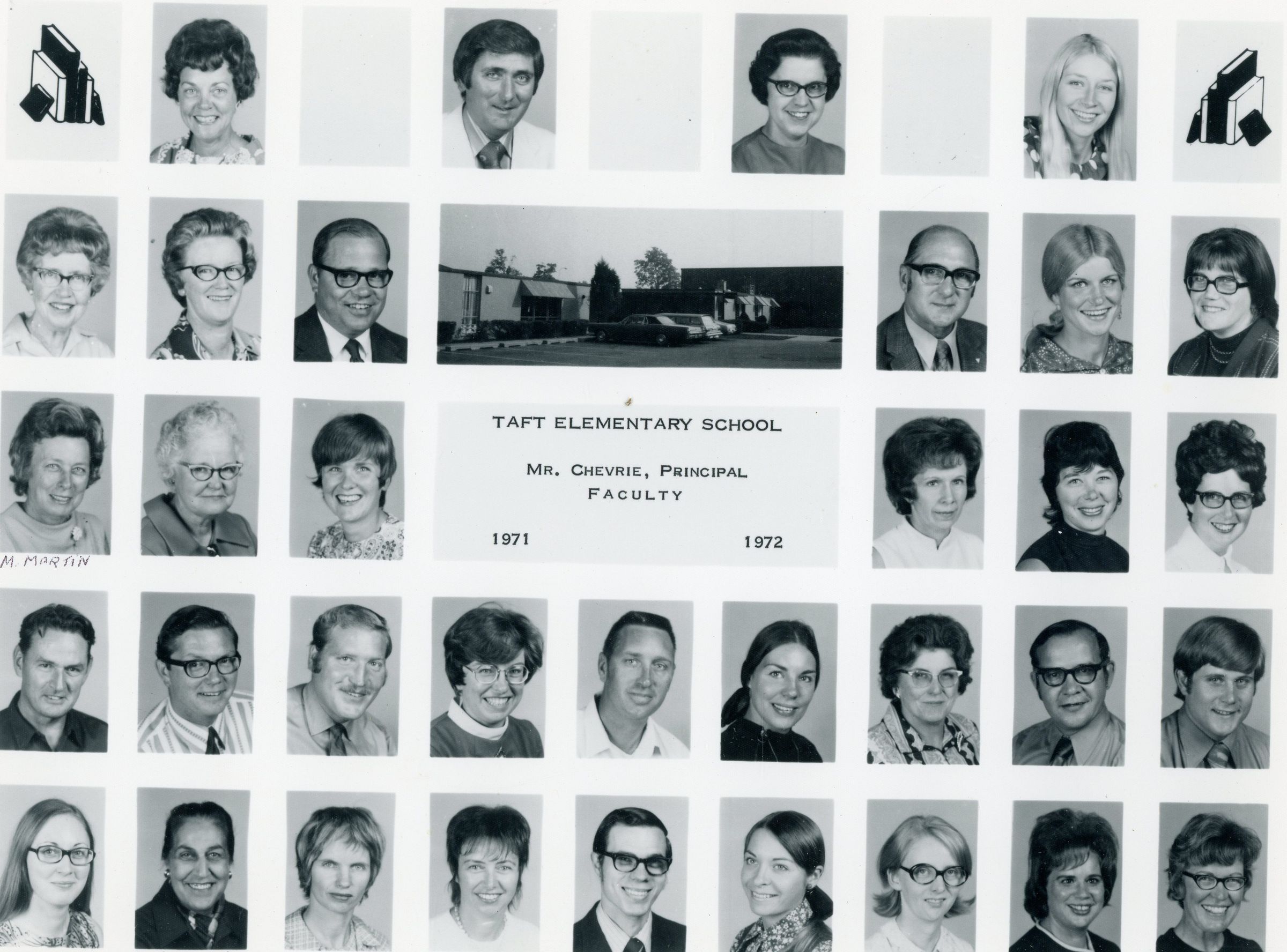 Taft School 1971-72 staff. (L-R) Meeker, Chevrie, Gursky, UK, Wadd, Block, Waggoner, Lada, UK, Anderson, Martin, Dumpierres, Nicholas, UK, UK, Street, UK, Valient, Collins, Tator, Moyers, UK, Meyers, Lajoy, UK, UK, Ballantine, UK, Lantzy, UK, UK, UK, Phillips, Alpervitz.Cataloged By