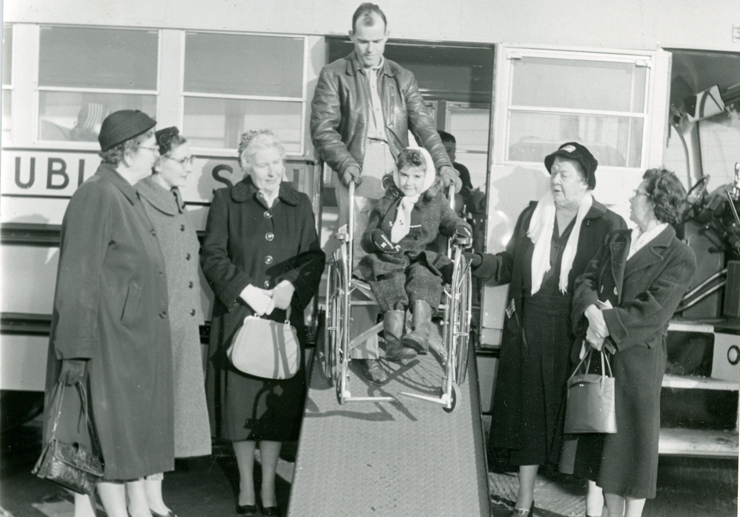New Bus with wheelchair ramp. Right of Wheelchair is Miriam Harris, Far left is Olive Shale. Unknown Year