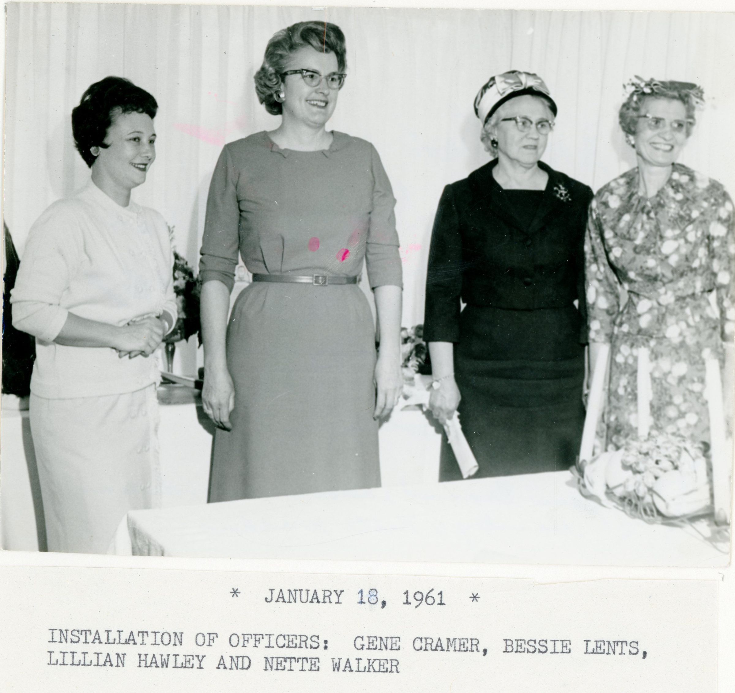 Installation of Garden Club Officers: Gene Cramer, Bessie Lents, Lillian Hawley and Nette Walker on Jan 18, 1961.