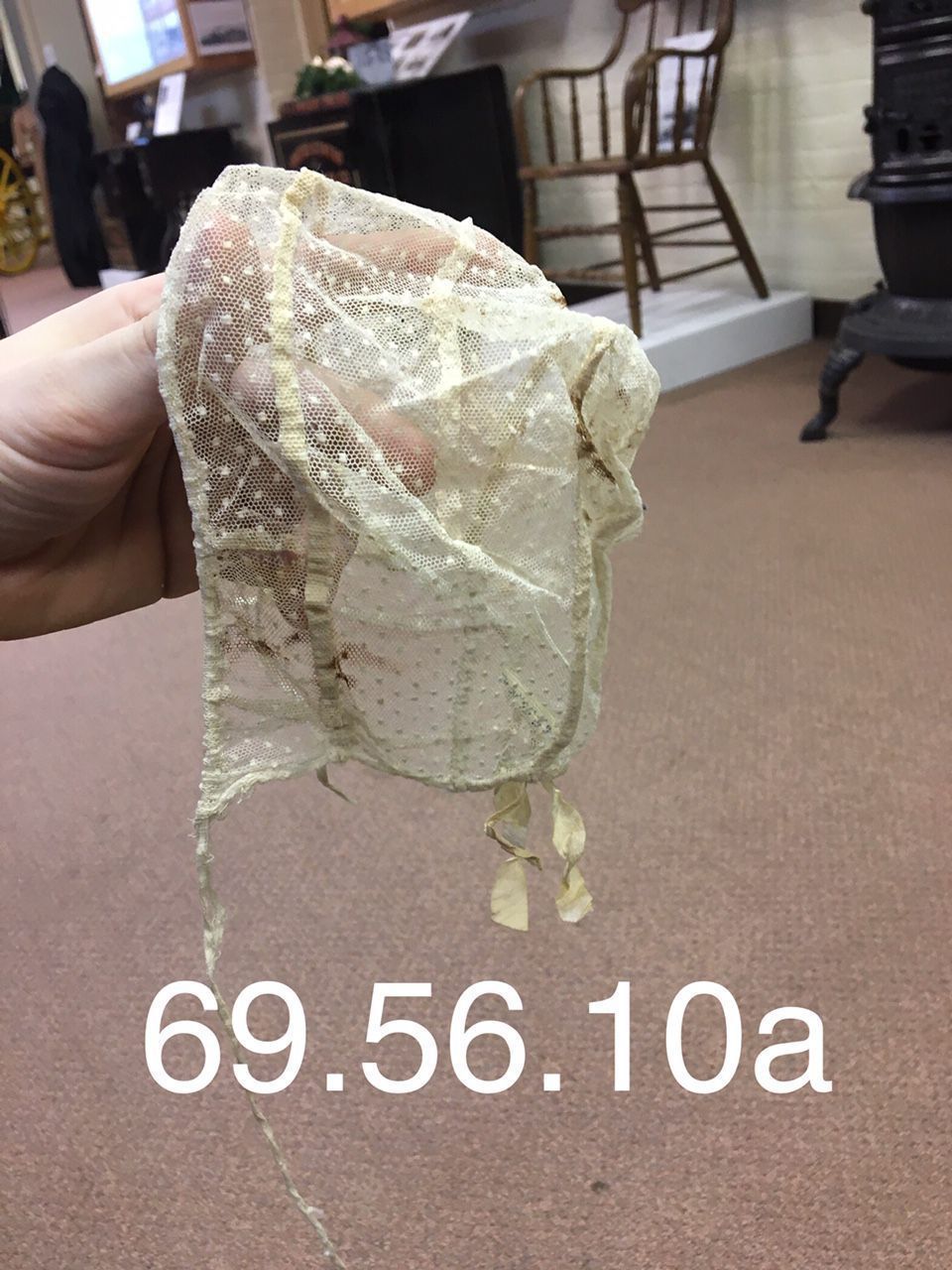Baby bonnet with dotted veiling, worn by Lizzie Stellwagen.