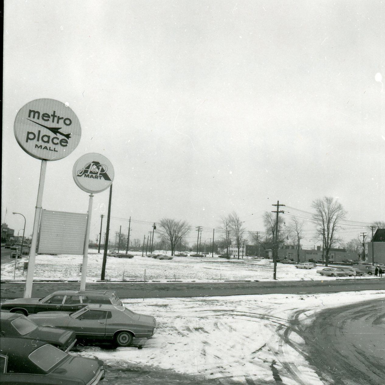 Newberry at Michigan, looking East. Methodist Church at far right. Feb. 1972, just after Urban Renewal. Metro Place and A&P Sign.