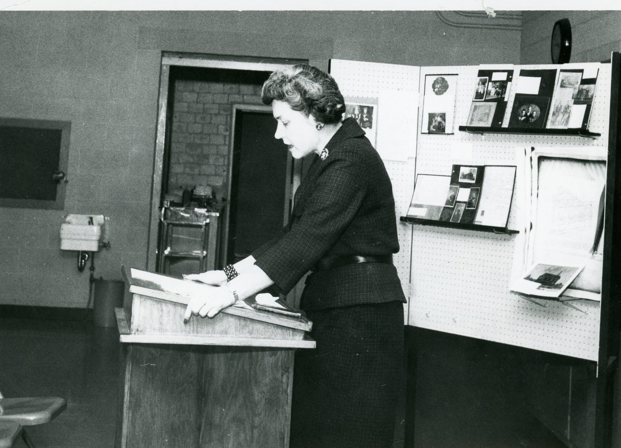 Mrs. Mildred Hanchett acting as narrator for Civil War program. Congregational Church Fellowship Hall, Nov 3, 1961.