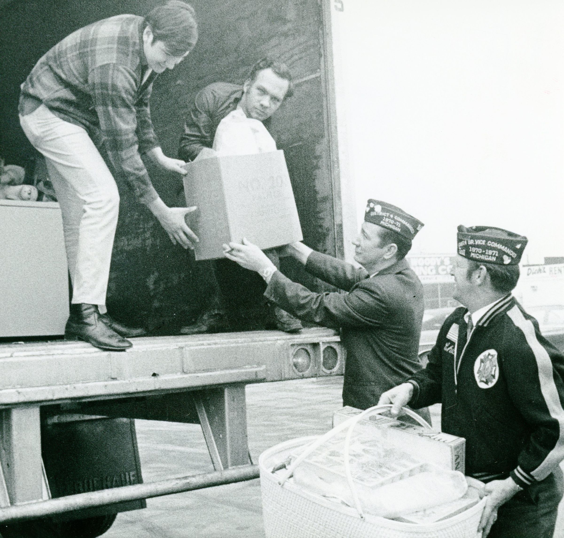 VFW Commander and Vice Commander helping load donations into a truck on Mar 15, 1971. Photo taken by the "Eagle". Could not read the title of the picture.