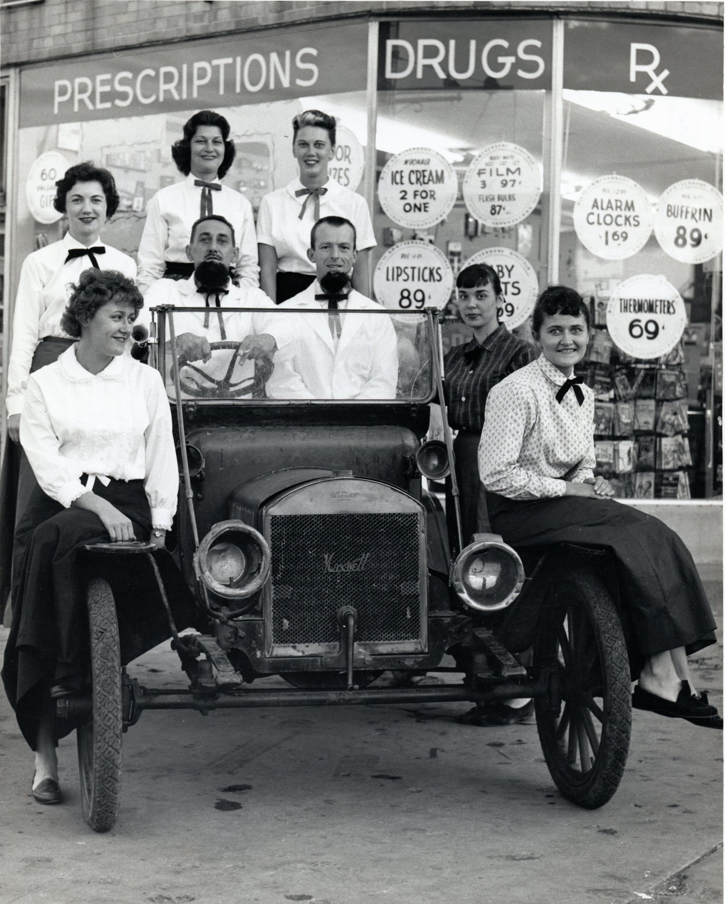 Jack O'Brien 50th anniversary. SE corner of Mich and Washington. In a Maxwell Car. Top row, L-R: Louise (Ficus) Sharp, Maxine Edgerly, Irene Warren. Middle row, L-R: Jack O'Brien, Clyde Warren, Mildred (Bell) Batterson. Last row, L-R: Patricia O'Brien, Judy (O'Brien) LukeCataloged By