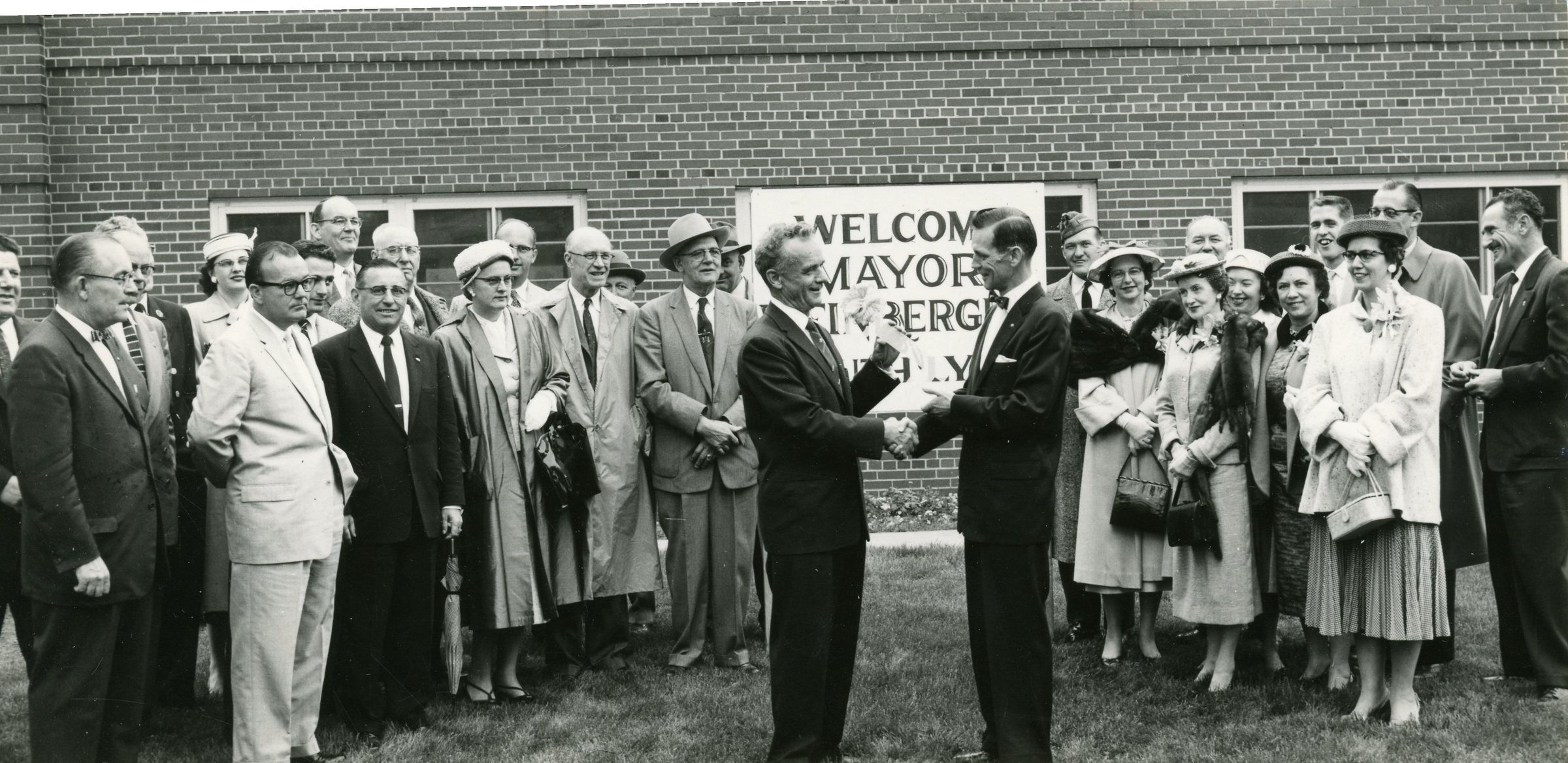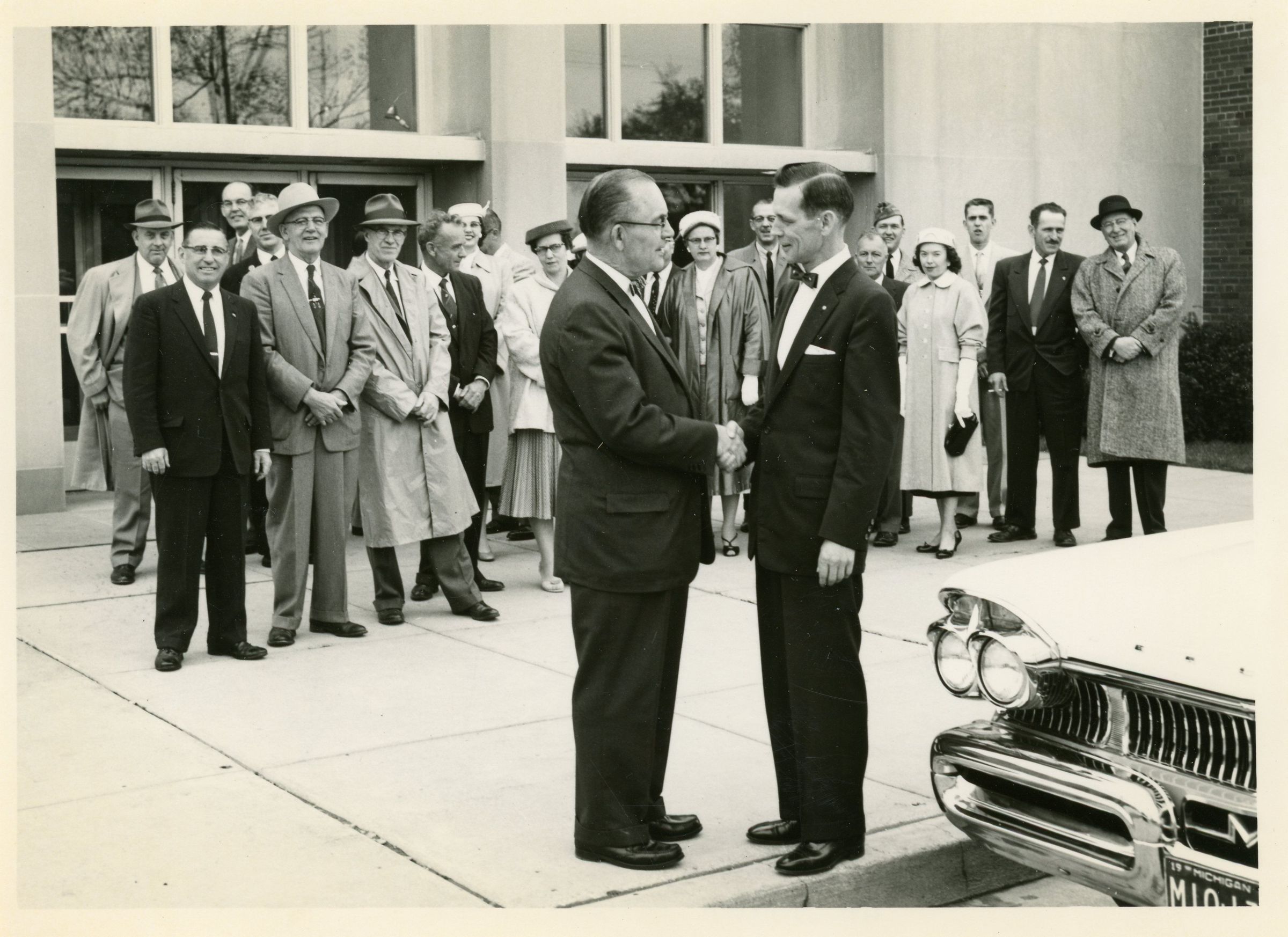 George Smith, mayor pro-tem greeting visiting mayor. Mayor exchange day, at Ford Lincoln Mercury plant