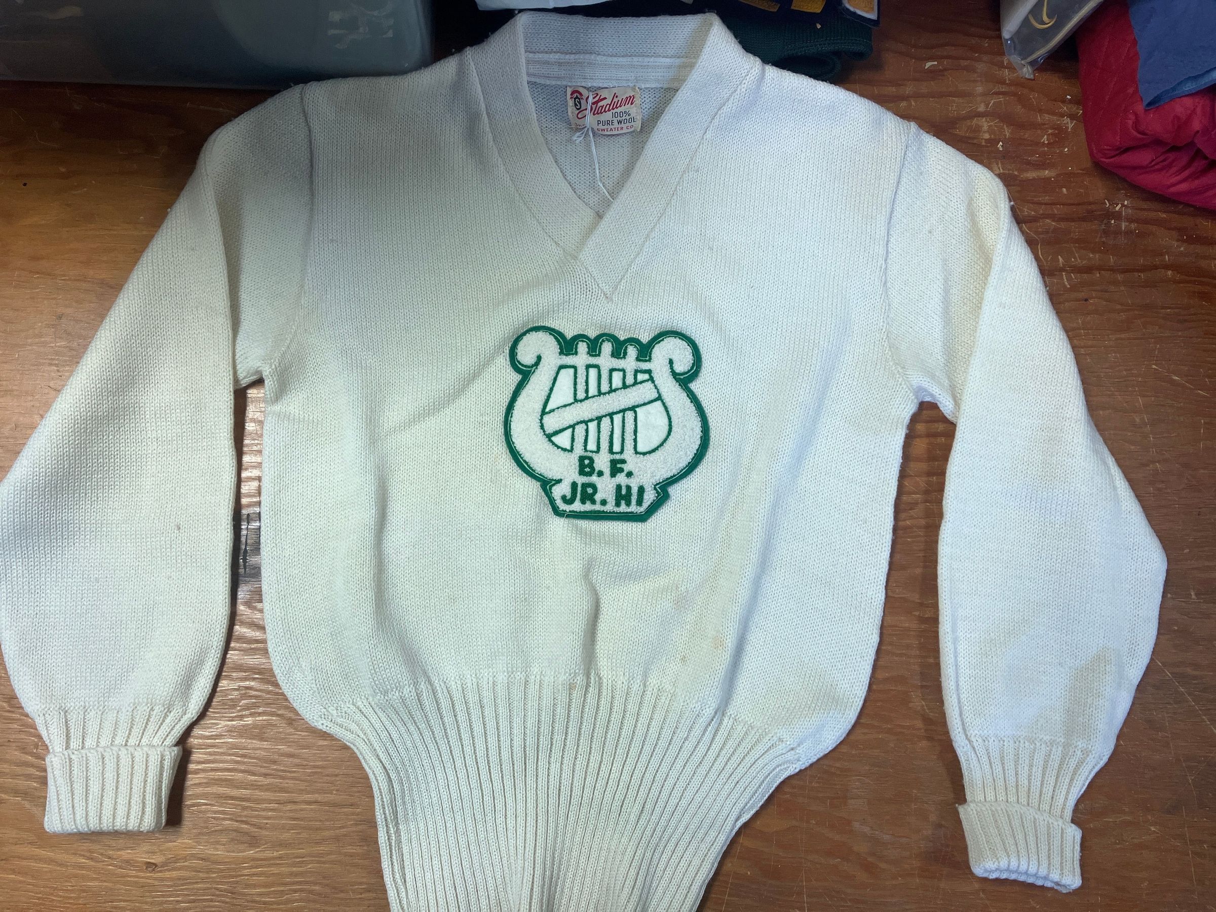 Ben Franklin Jr. High band sweater. C. 1967. Owned by Sherry Rowe Green.