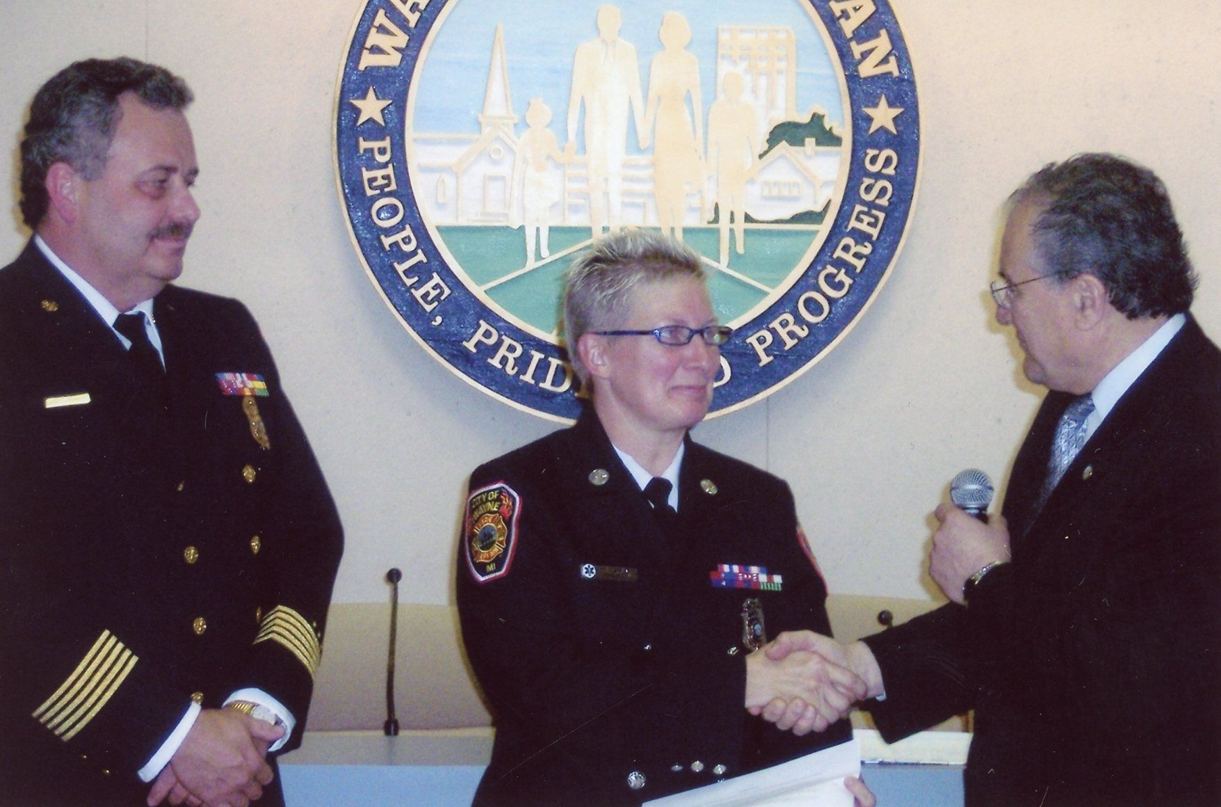 City of Wayne Mayor Al Haidous shaking hands with Firefighter Cindy Boring. To the left is Chief Tim Reylonds.