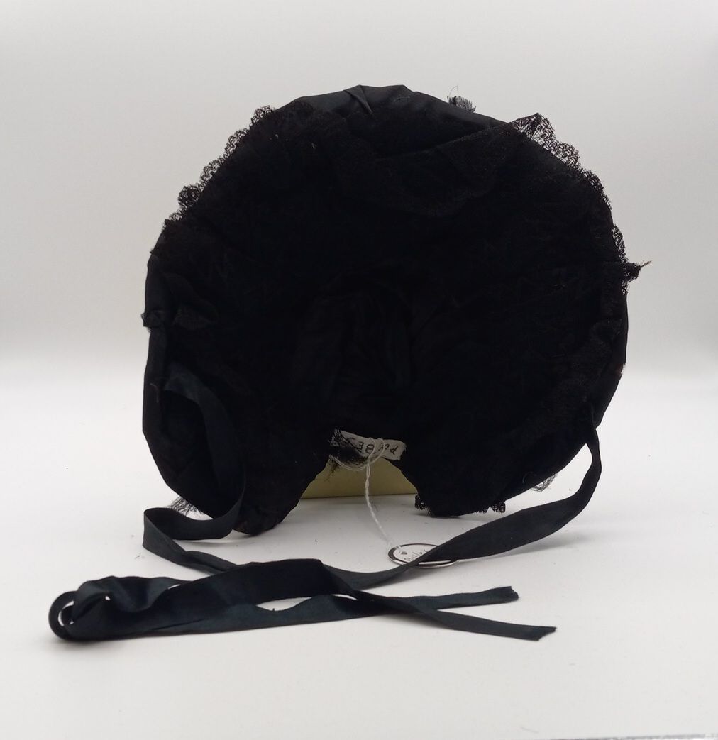 Black bonnet, part of a matching set alongside a black taffeta dress, cape, and petticoat.Context