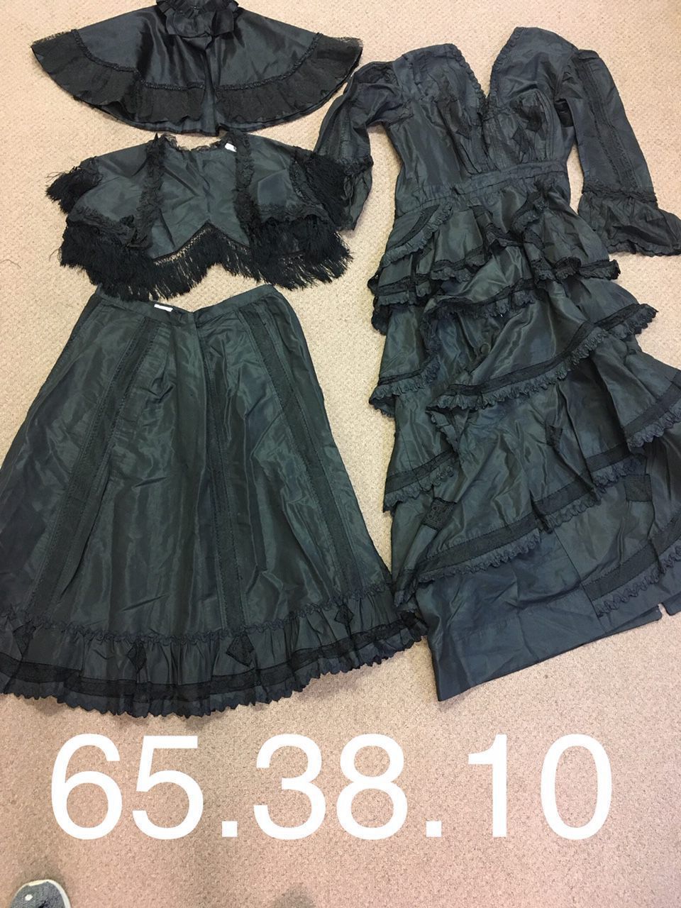 This black taffeta set contains a dress, petticoat, capelet, and additionally a bonnet photographed seperately,Context