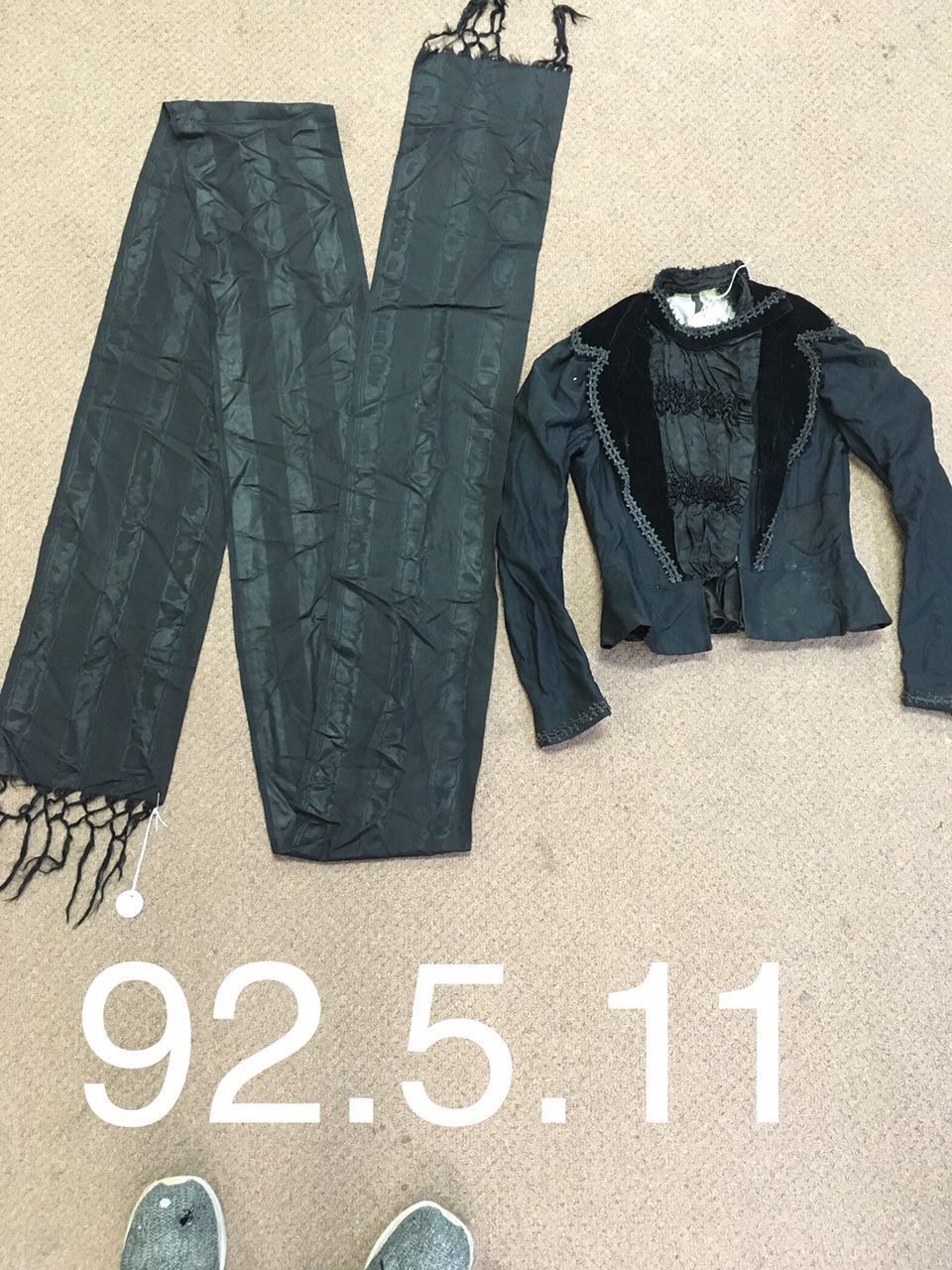 Black Ornate waist Jacket and scarf donated by Dorothy Ballantine. C. 1870 - 1880.