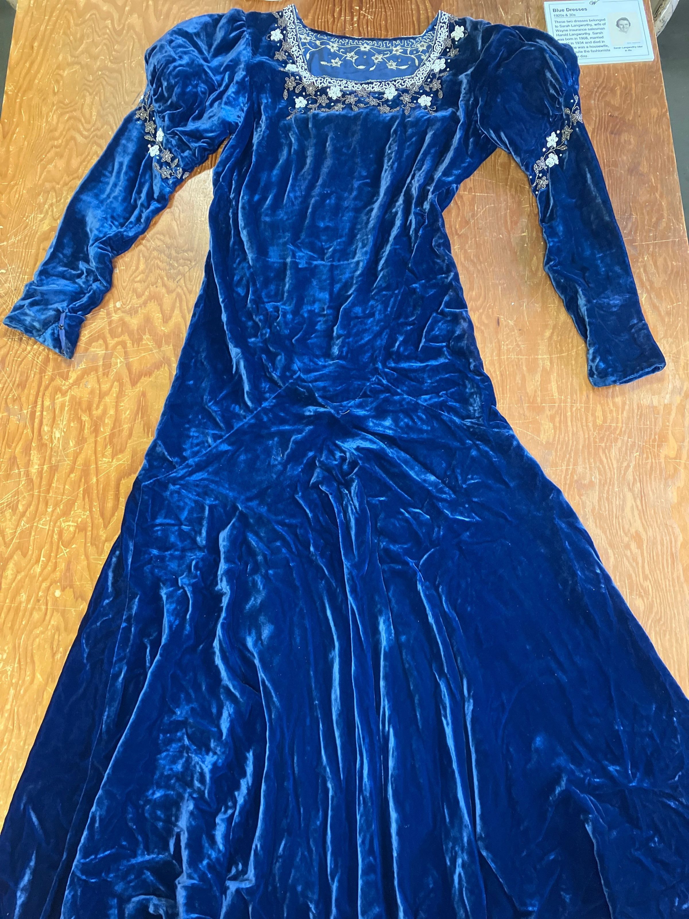 Blue velvet dress, with white beading. Puffed sleeves. owned by Sarah Larsen.