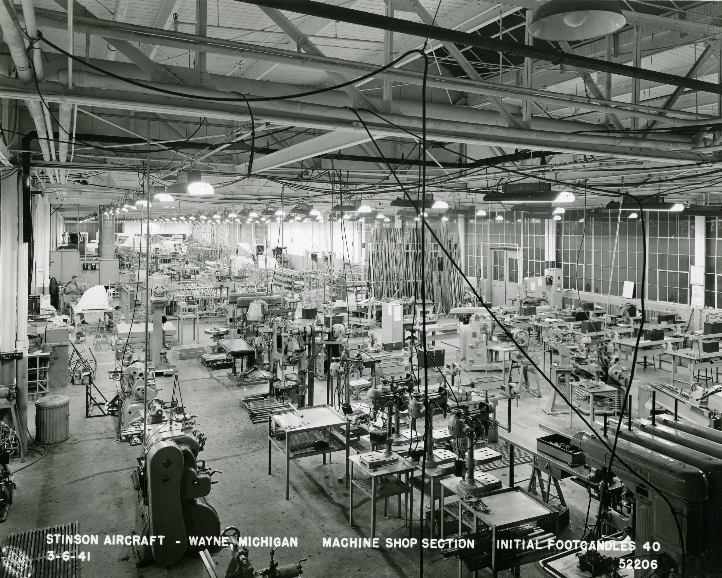 Inside the Stinson Aircraft Factory in the machine shop section. The Stinson Airplane Factory was located in the Detroit-Wayne Industrial Airport. The airport property followed Van Born, Ecorse, Cogswell and the Pere-Marquette railroad.Cataloged By