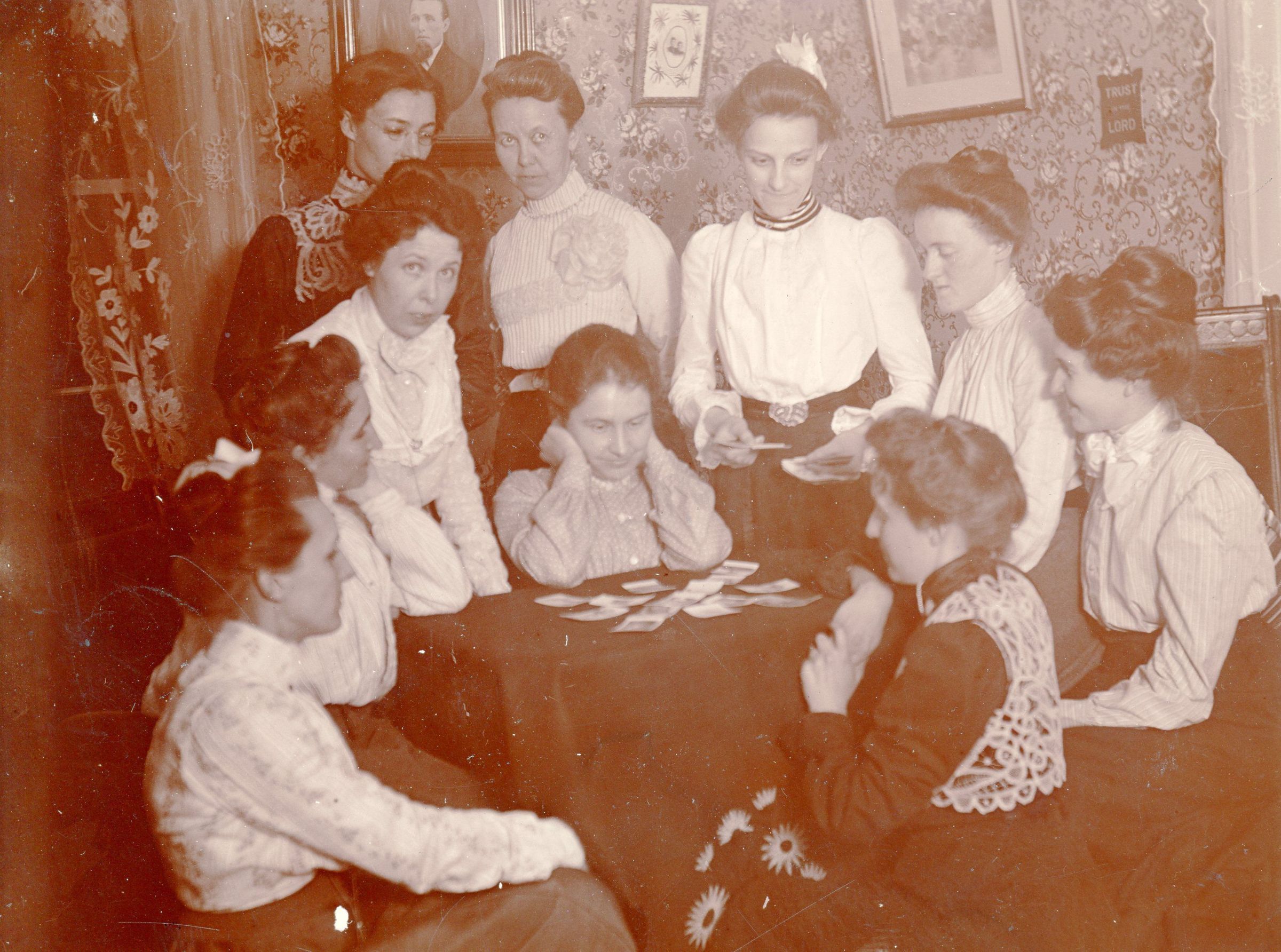 Spinster Club Members Back Row from Left to Right: Mammie Chaffee, Ida Collar, Anna Cady and Mr. Russel's Niece. Middle Row from Left to Right: Emma John, Lulu Blackmore, Floy Warner and Nellie Freeman. Front Row: Alice Cady and Anna Chamberlain. Photo taken in 1899.Cataloged By