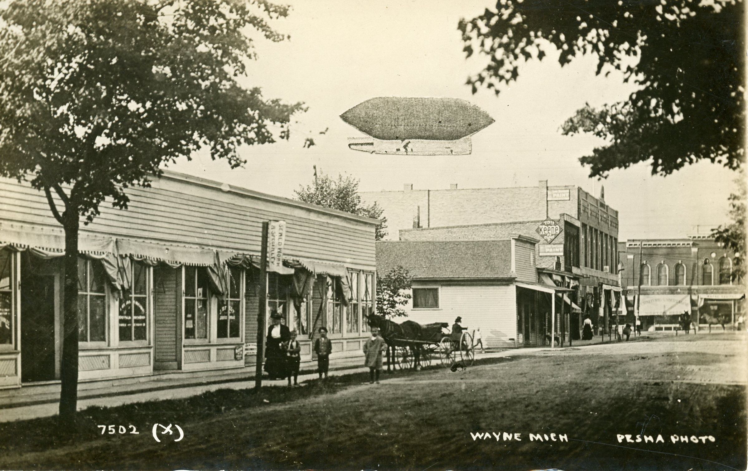 3718-3602 Monroe, looking North from Main to Michigan. Trick photo showing blimp. 1909.